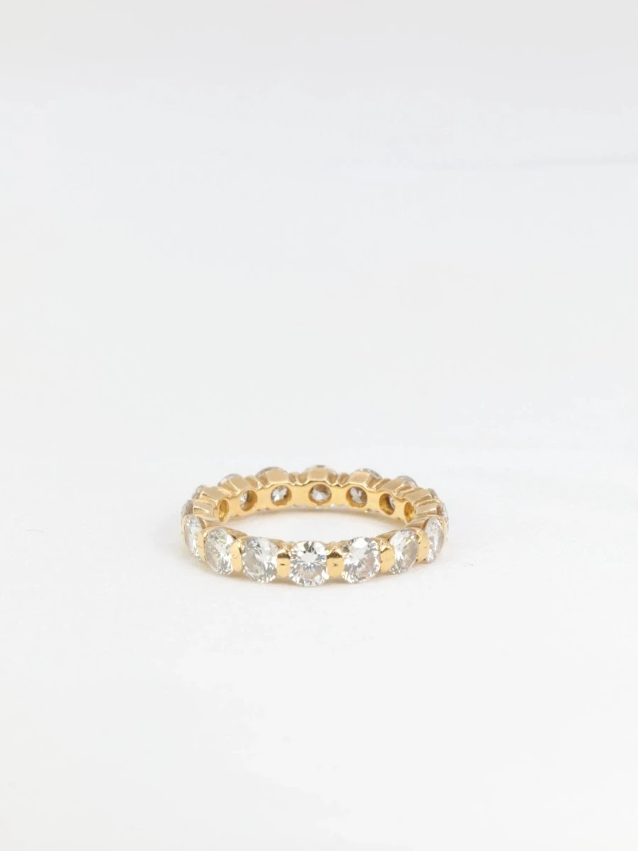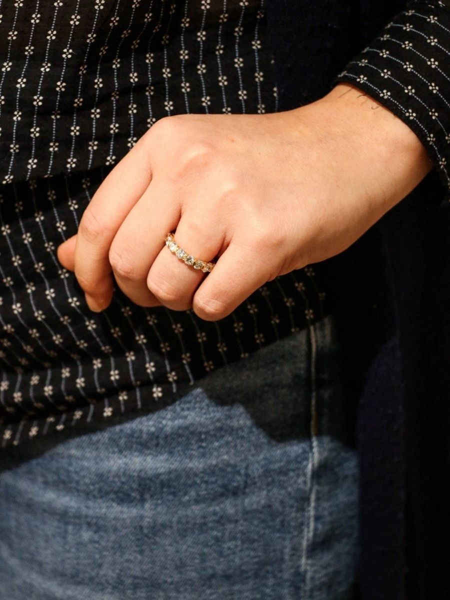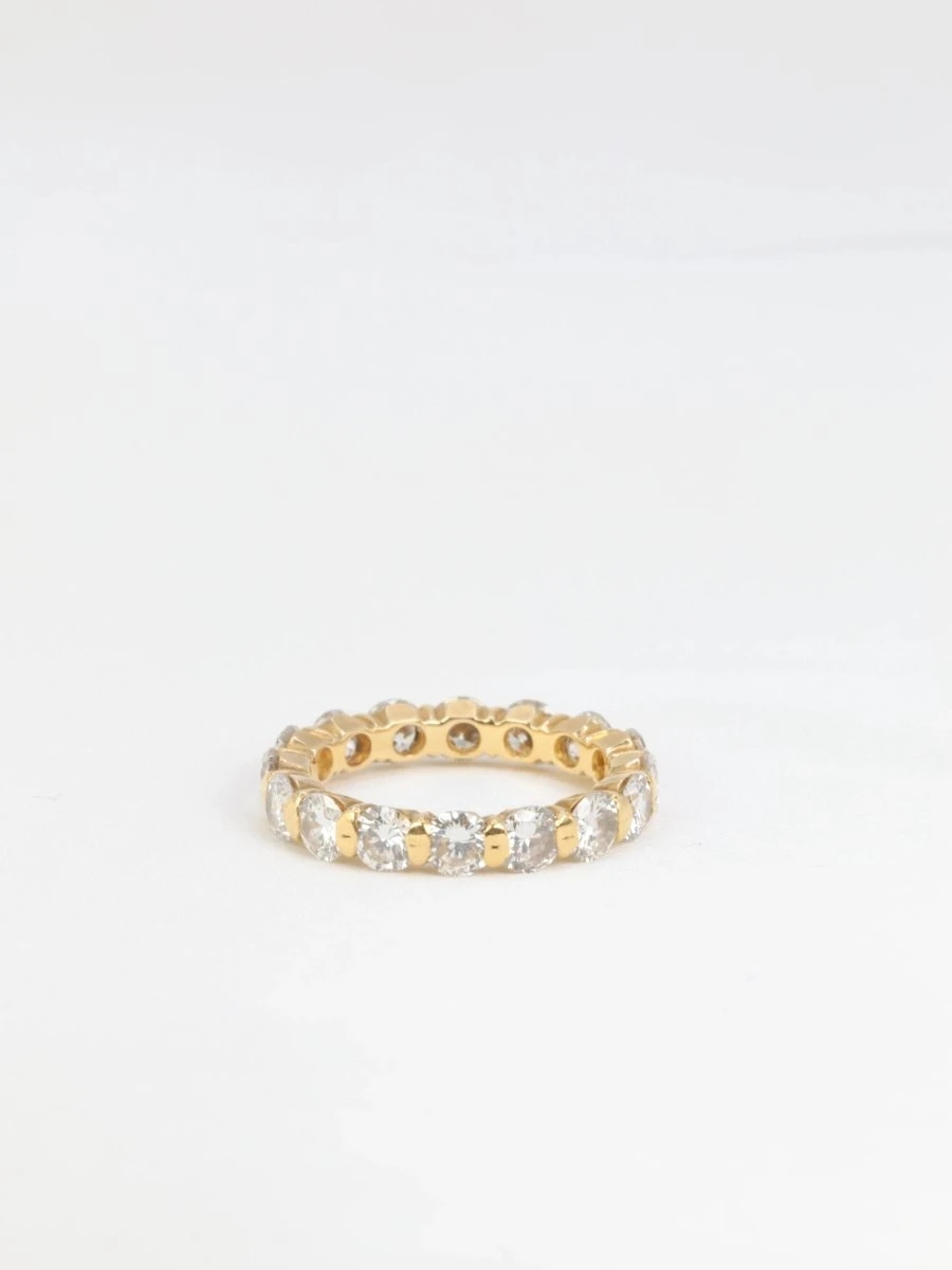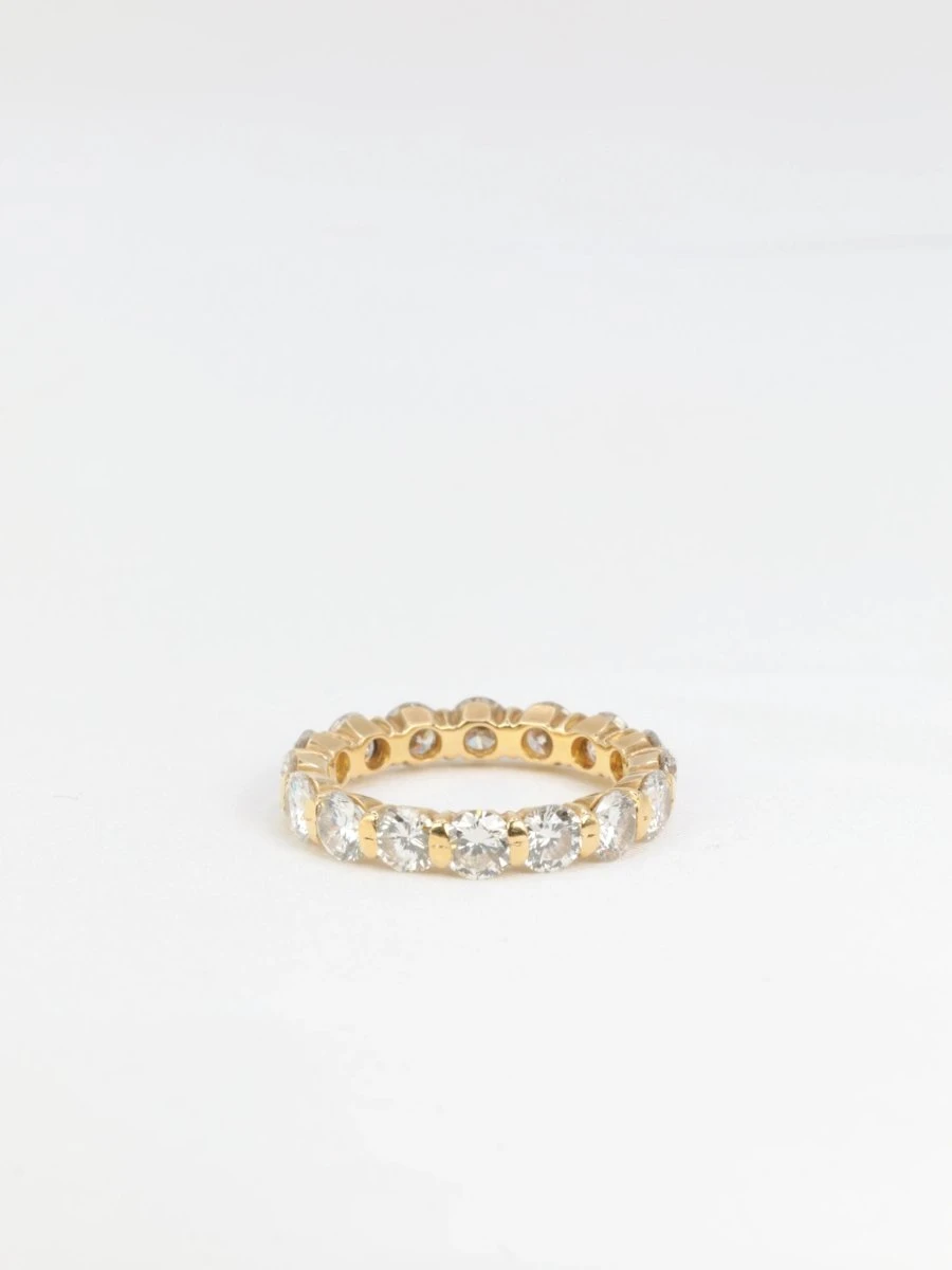 Alliance américaine en or 18k (750°/°°) sertie de 16 diamants taille brillant pesant environ 0,23ct chacun (diamètre 4mm), soit un poids total d’environ 3,7 carats de qualité estimée F/G VS. Travail probablement français des années 1980.