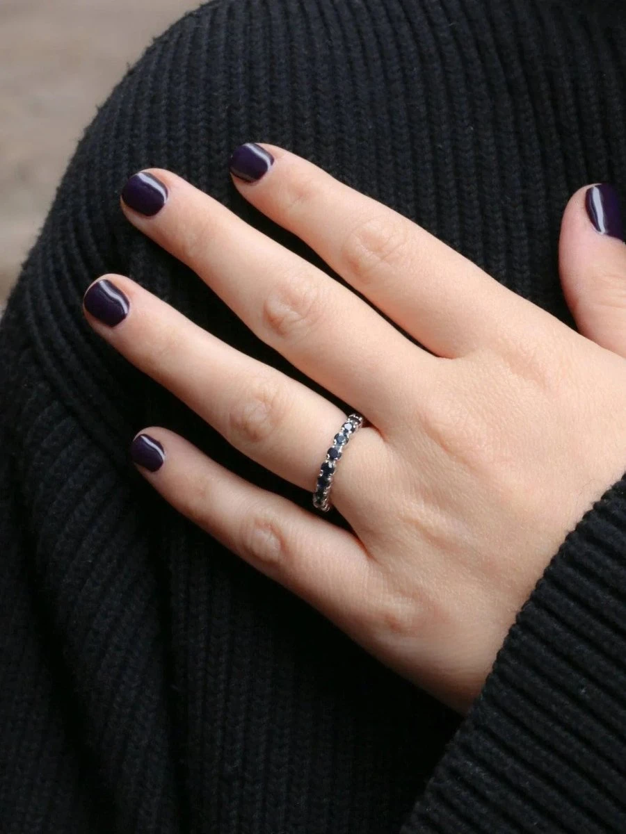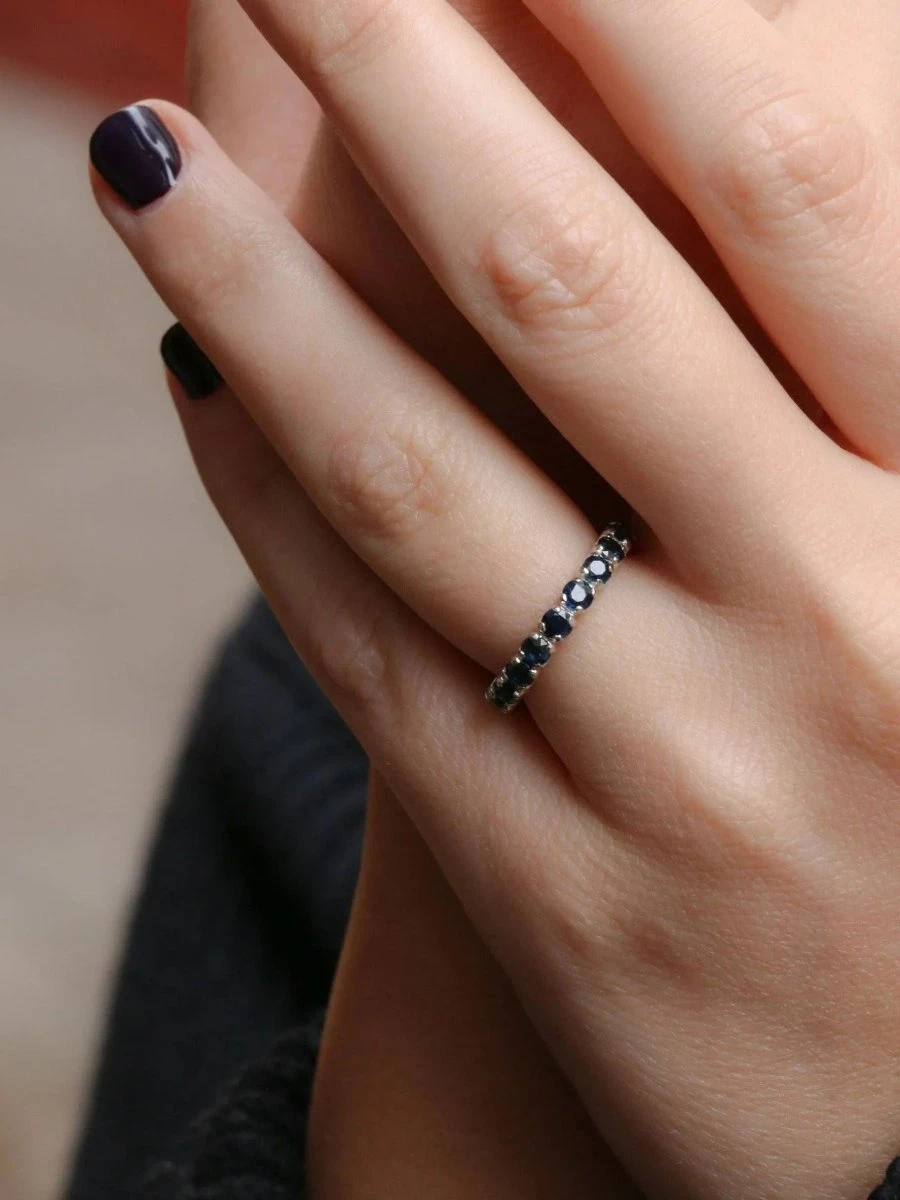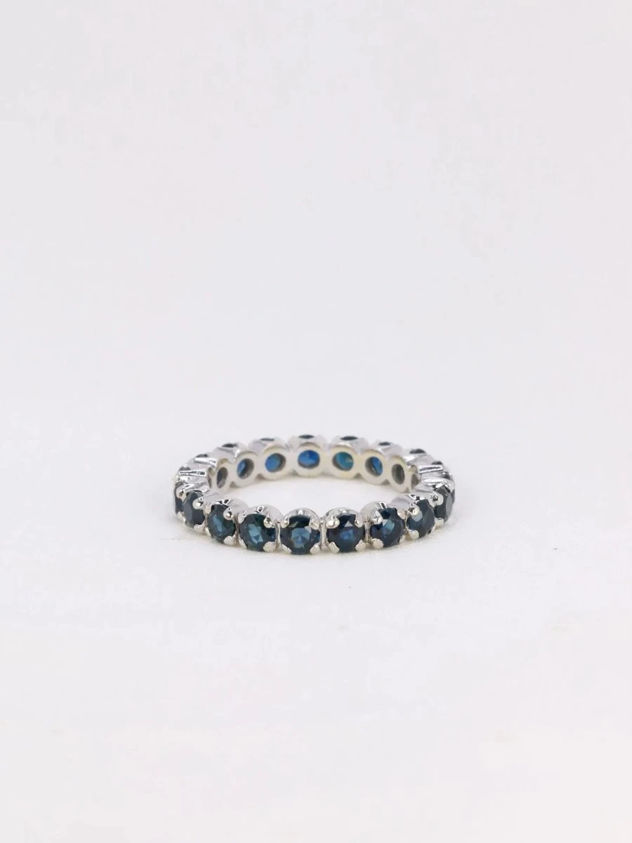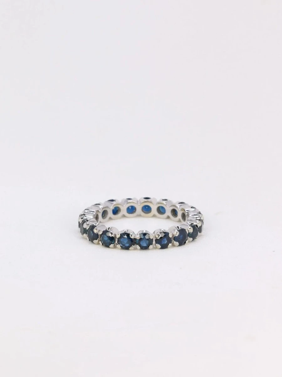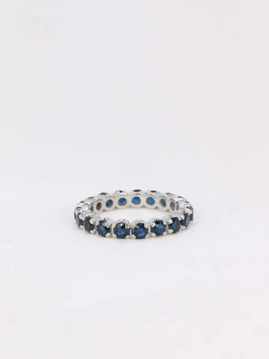 Alliance américaine en or blanc 18k (750°/°°) sertie de 19 saphirs taille brillant de 0,11 ct chacun pour un poids total d’environ 2 ct.