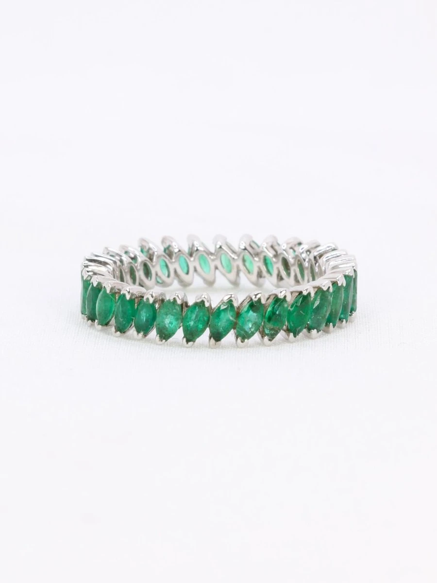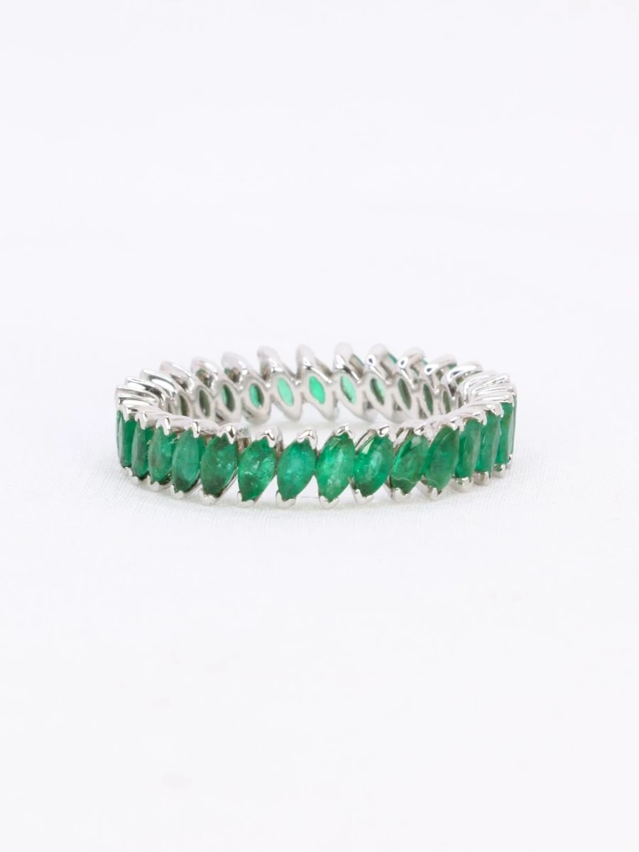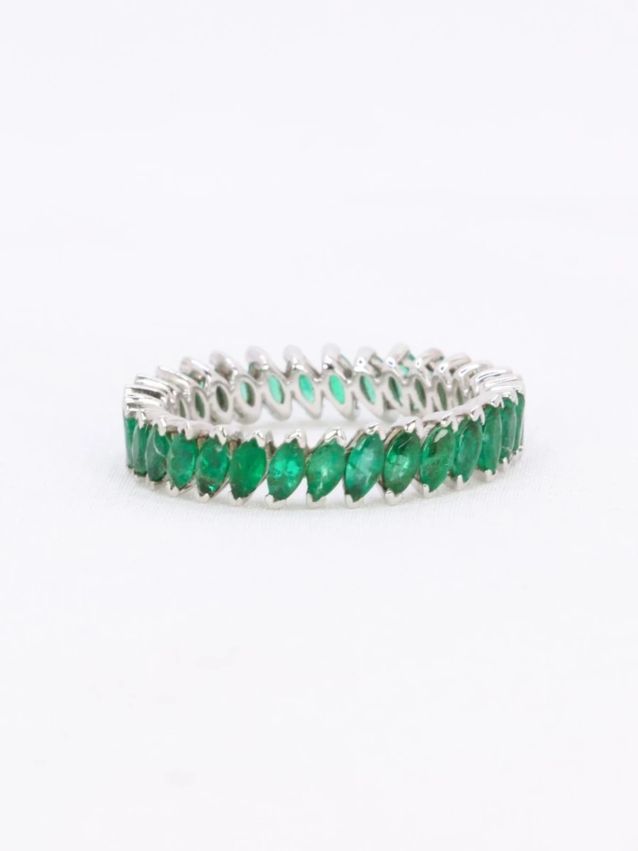 Alliance américaine en or blanc 18K (750°/°°) sertie de 30 émeraudes taille marquise pour un poids total d’environ 2 carats. Travail vintage probablement Italien.