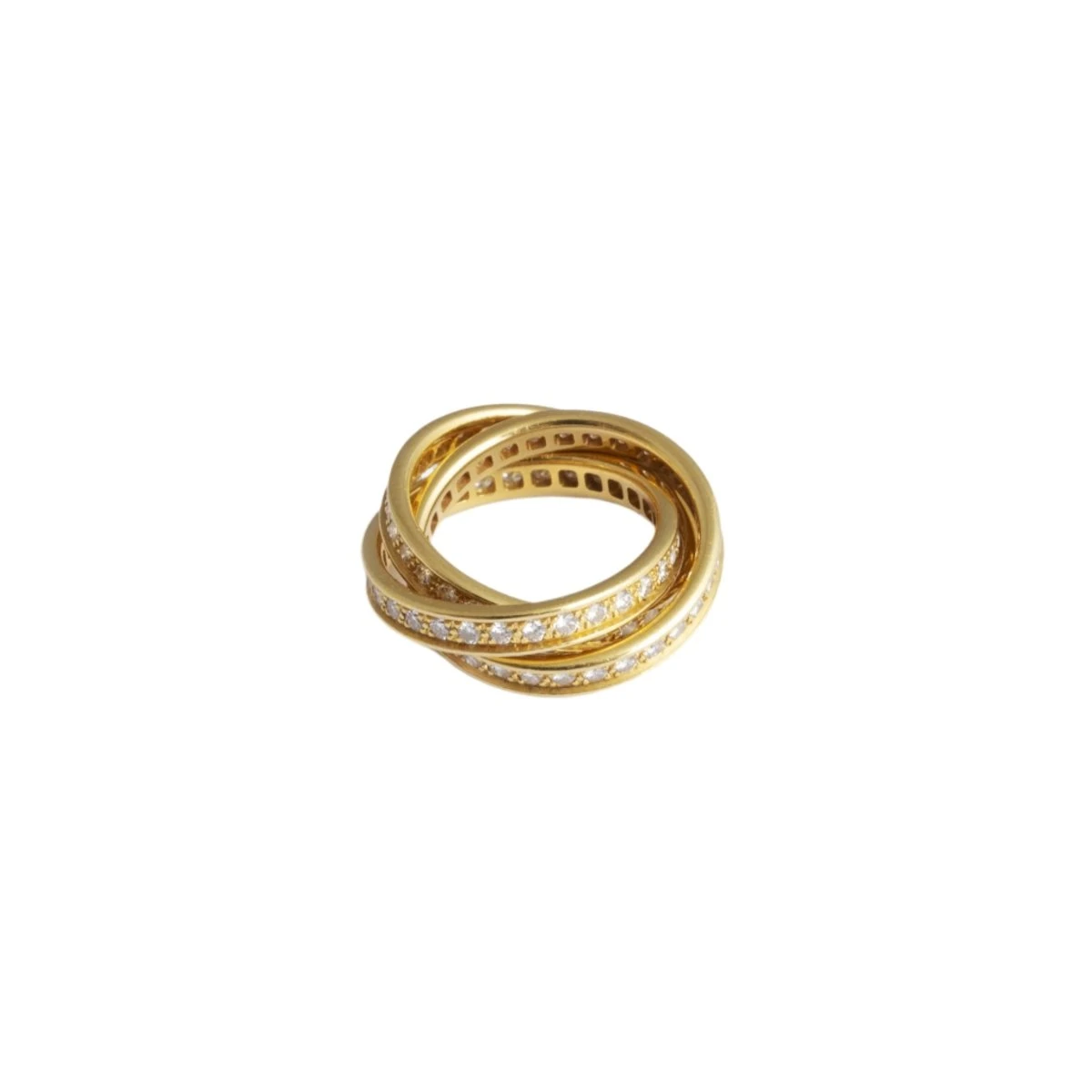 Bague Alliance CARTIER « Trinity » en or jaune 18 carats, pavée de diamants sur chaque anneau.