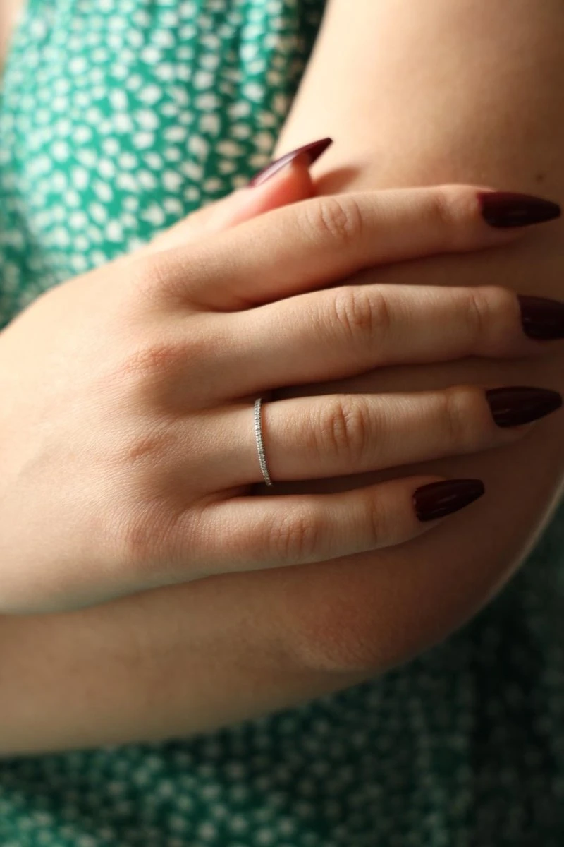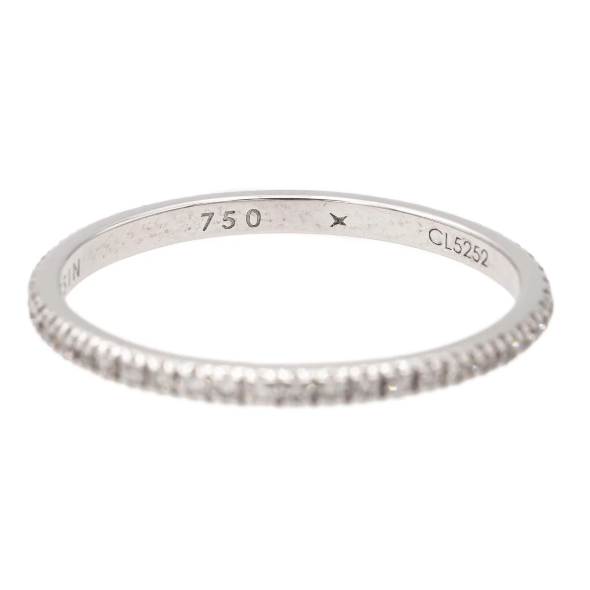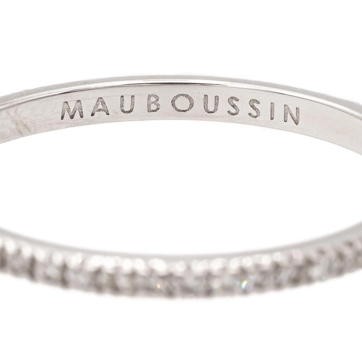 Alliance signée de la Maison Mauboussin. model Parce que je l’aime. en or blanc 750 millièmes (18 carats). sertie de diamants taille brillant. d’environ 0.005 ct chacun. poids total diamants: environ 0.25 ct. largeur sur le dessus: 0.16 cm. tour de doigt: 51. poids total: 1.03 g. numérotée: CL5252. valeur neuve: 1335€. excellent état