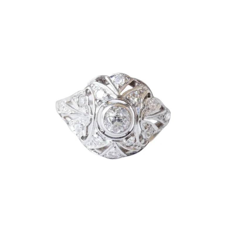 Bague Dôme Art Déco en or blanc 18 carats à décor floral, centrée d’un diamant taille ancienne carats monté en sertis clos dans son entourage de motifs floraux orné de 12 diamants taille ancienne. Circa 1920. Travail français