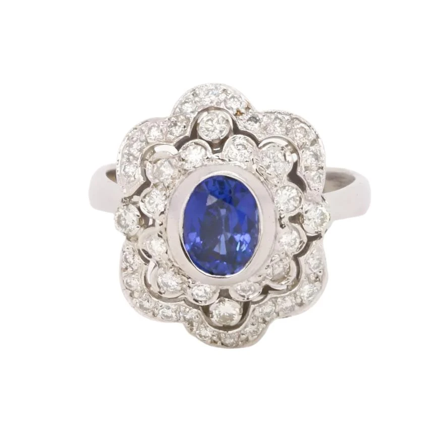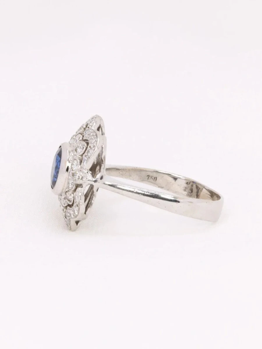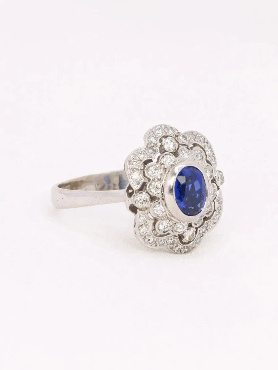 Bague en or blanc 18k (750°/°°) à chaton polylobé sertie en son centre d’un saphir ovale de belle couleur pesant environ 1 carat dans un entourage ajouré serti de diamants taille brillant pour un poids total d’environ 1 carat. Travail contemporain dans le goût de l’Art Déco. Présence d’un poinçon 750 pour l’or 18 carats.