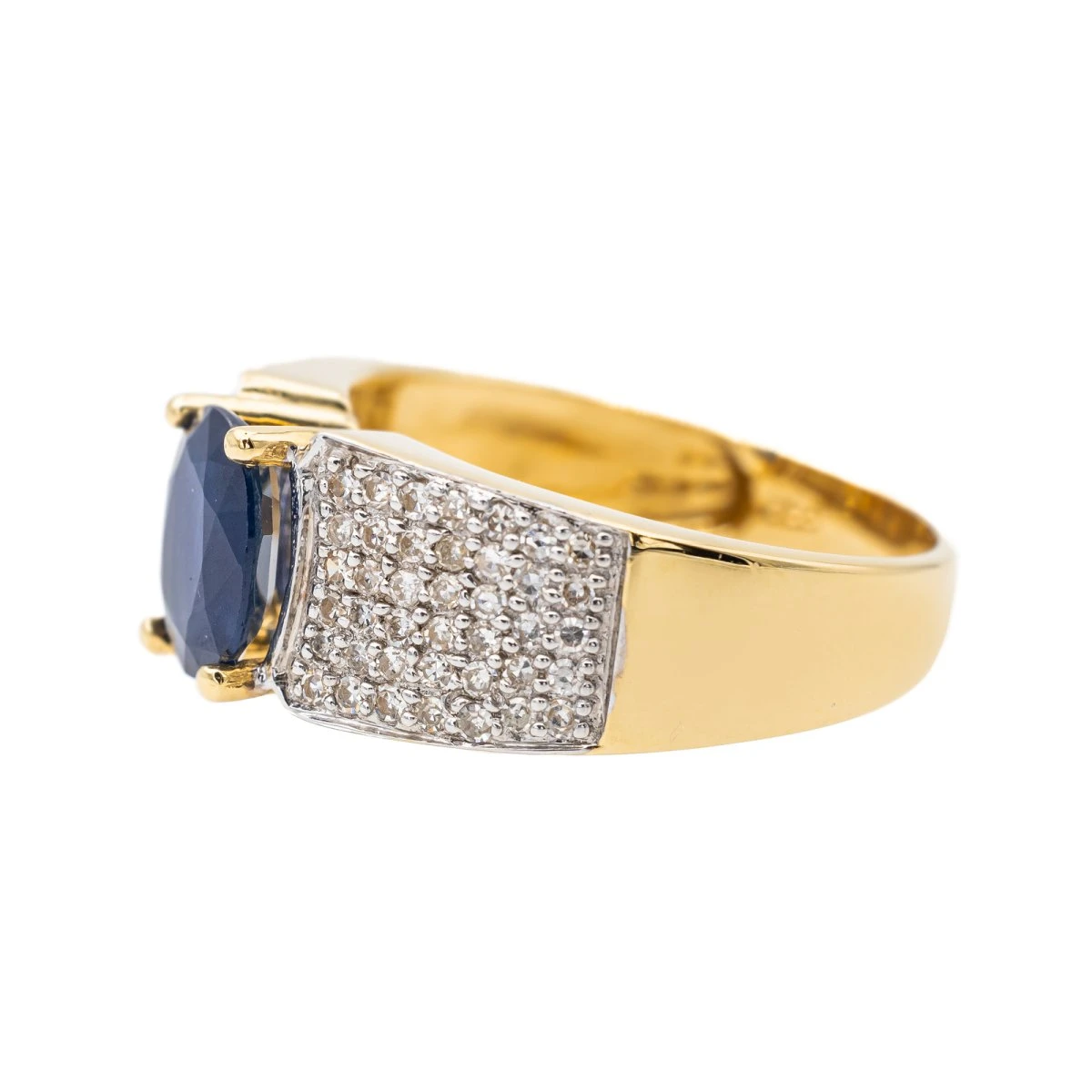 Bague en or jaune et blanc 750 millièmes (18 carats). sertie de saphir et de diamants. un saphir taille ovale. d’un poids total d’environ 1.23 cts. entouré de 80 diamants taille brillant. d’un poids total d’environ 0.40 ct. (chaque diamant d’un poids d’environ 0.005 ct). largeur sur le dessus : 0.86 cm. tour de doigt : 55.5. poids total : 4.85 g. poinçon tête d’aigle. excellent état