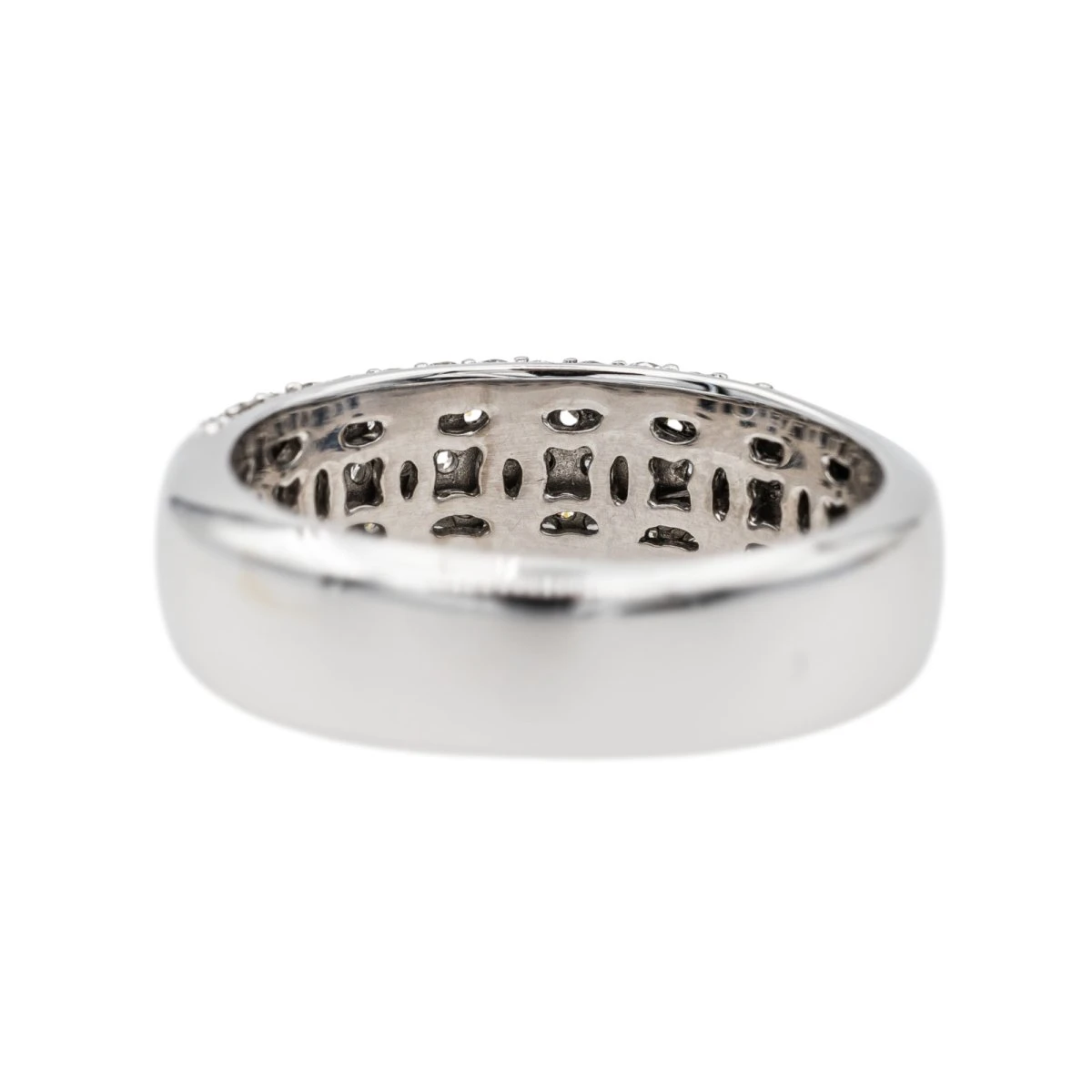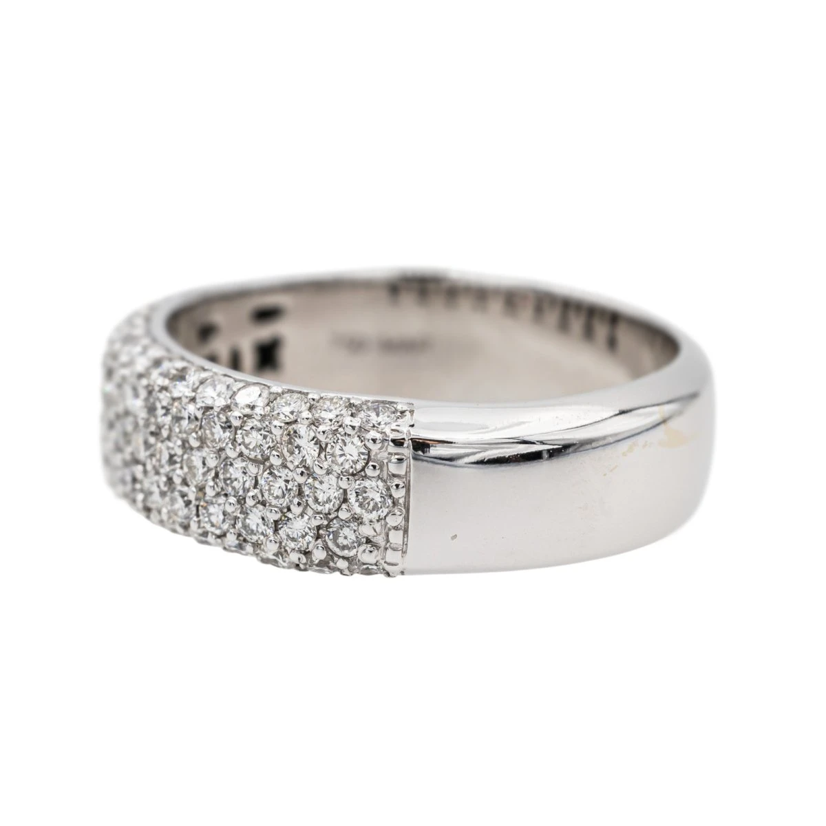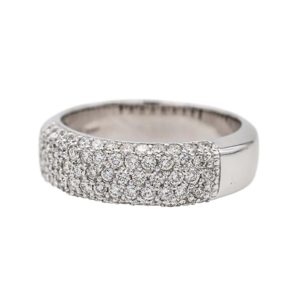 Bague en or blanc 750 millièmes (18 carats). pavée de diamants. 63 diamants taille brillant. d’un poids total d’environ 0.75 ct. largeur sur le dessus : 0.62 cm. tour de doigt : 54. poids total : 6.72 g. poinçon hibou. excellent état