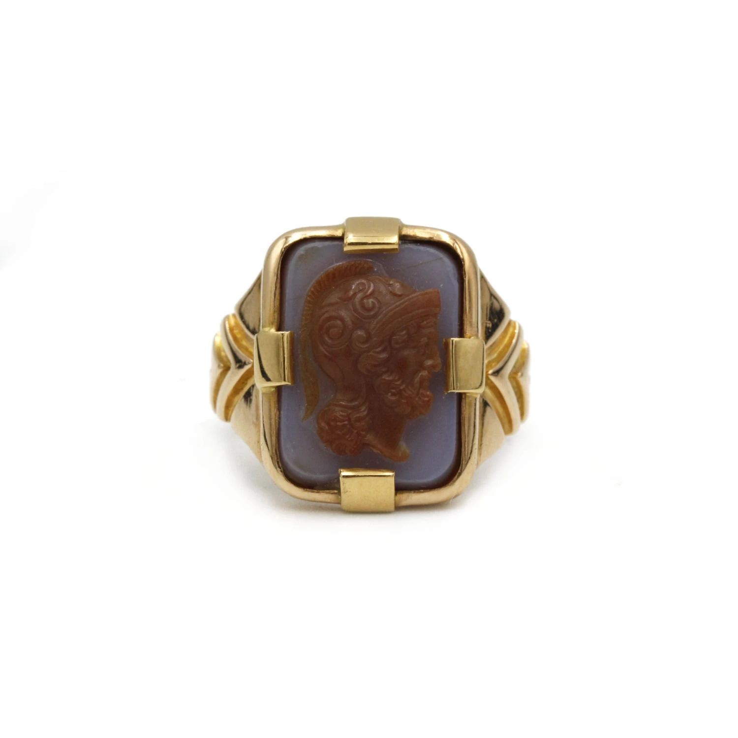 Ancienne bague chevalière en or jaune 750‰, sertie d’un camée agate rectangulaire à trois couleurs (brun-blanc-brun) représentant un guerrier grec casqué.