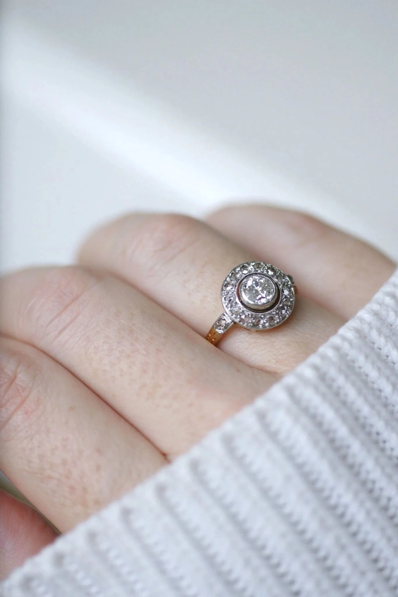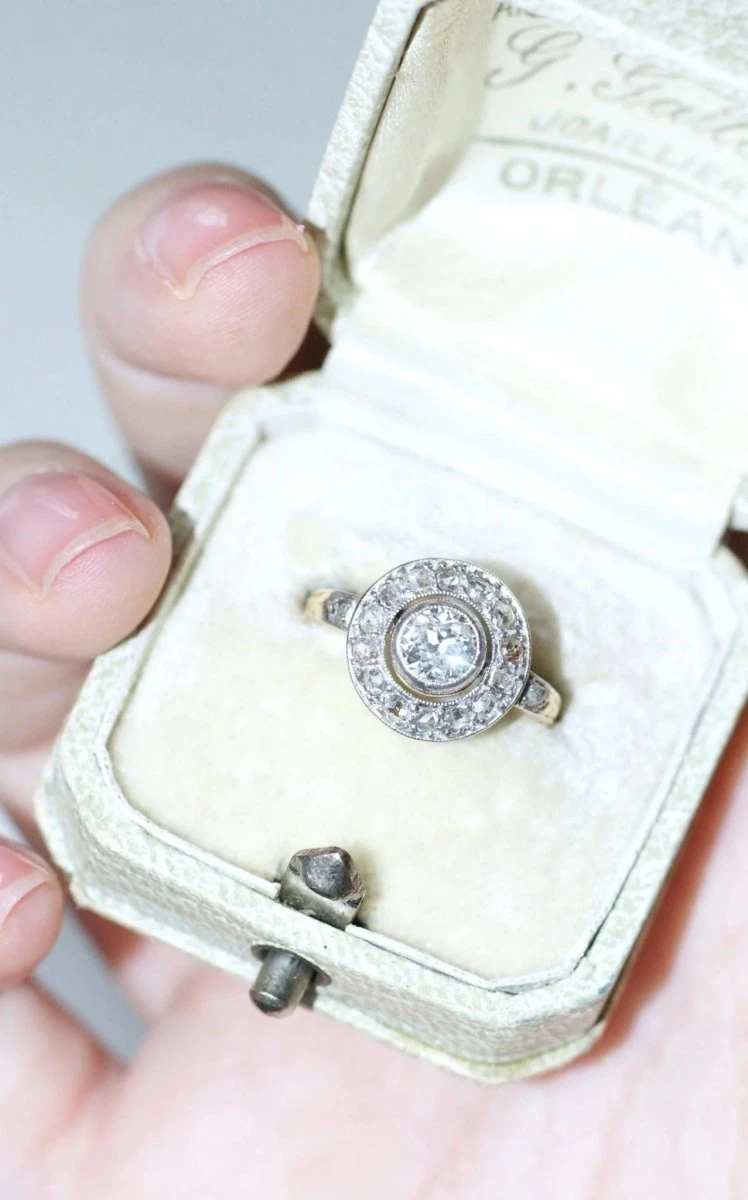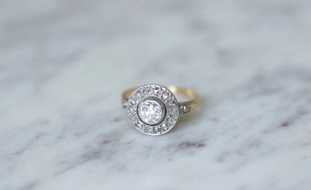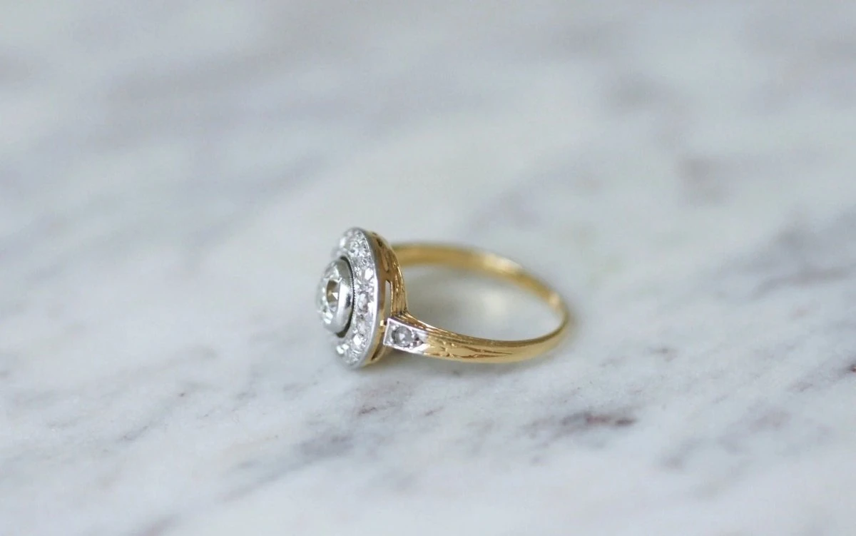 Bague cible en or jaune 18Kt et platine (poinçons : hibou et mascaron), sertie en son centre d’un diamant taille ancienne, dont le poids est estimé à environ 0,55 Ct (couleur estimée H, pureté estimée SI2), dans un entourage de diamants taillés en rose dont le poids total est estimé à environ 0.20Ct.