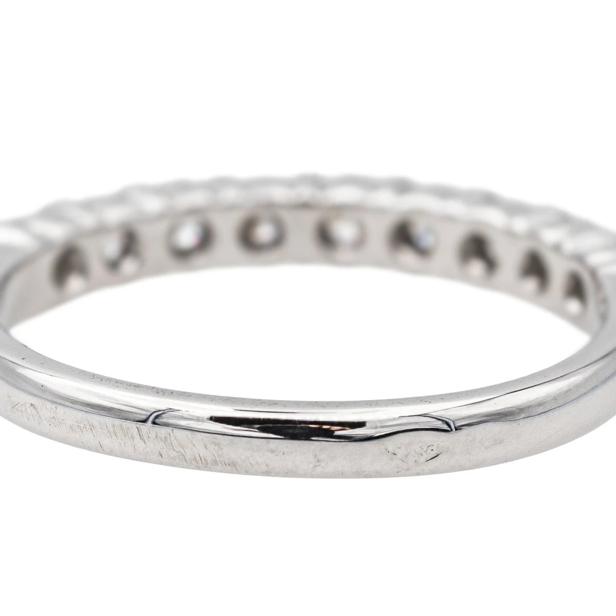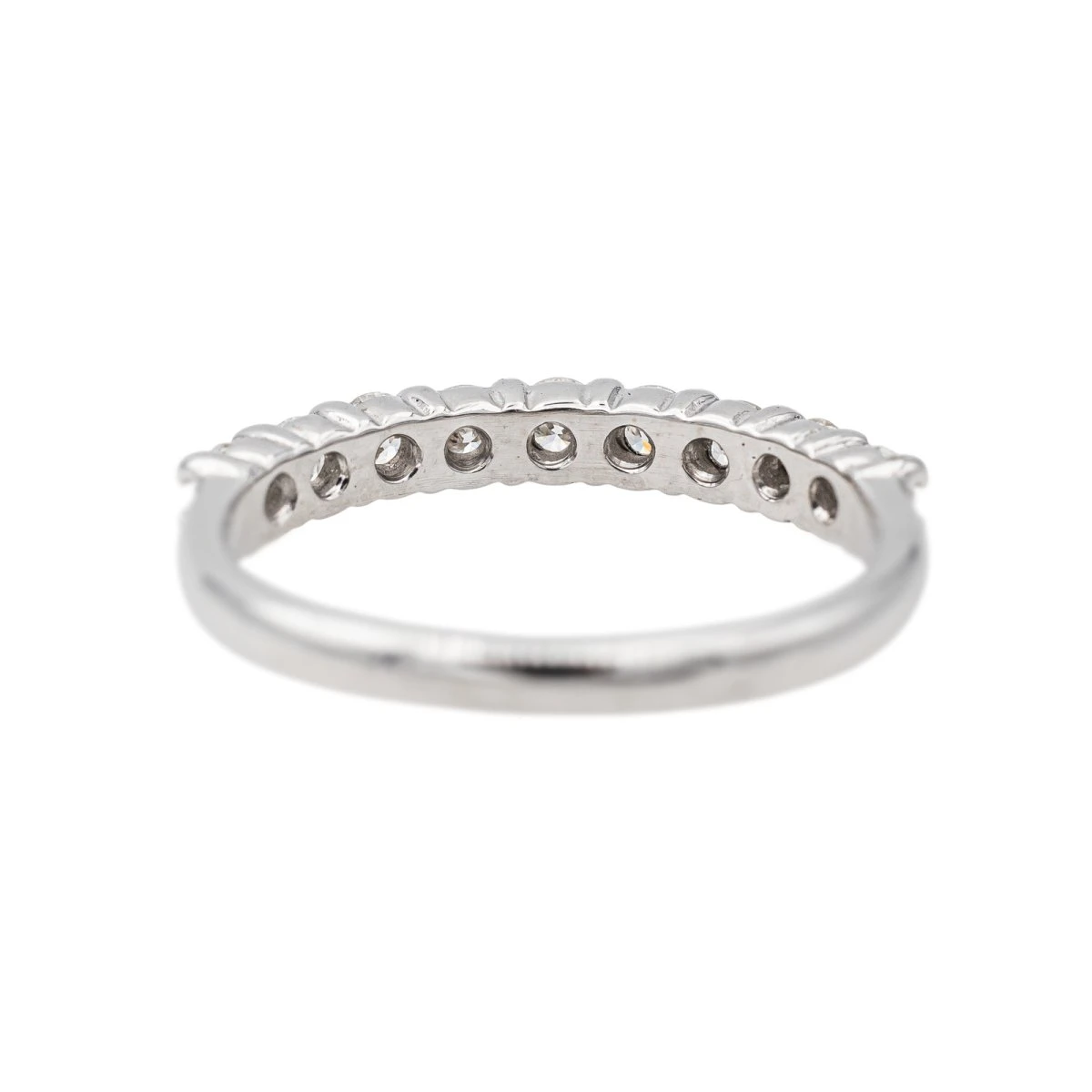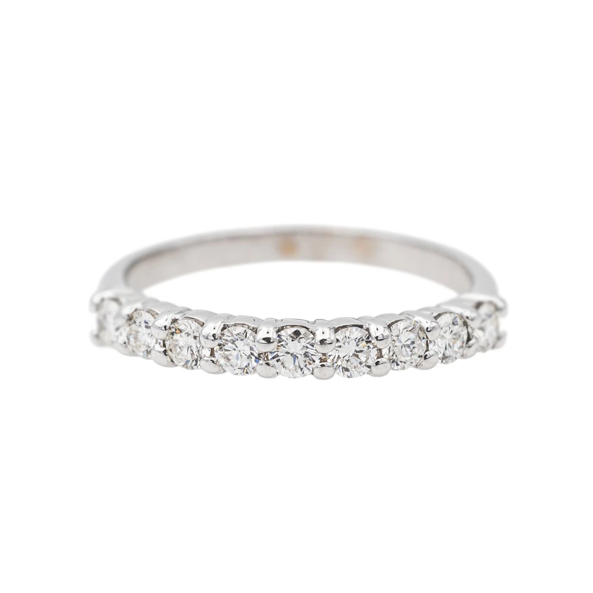 Demi-alliance en or blanc 750 millièmes (18 carats). sertie de 9 diamants taille brillant. d’environ 0.05 ct chacun. poids total diamants : environ 0.45 ct. largeur sur le dessus : 0.26 cm. tour de doigt : 51. poids total : 2.31 g. poinçon tête d’aigle. excellent état