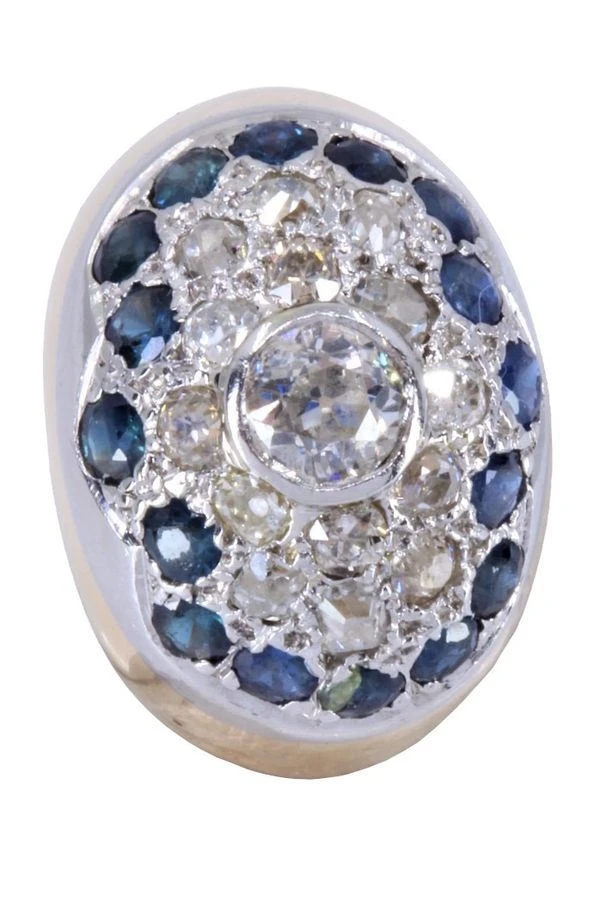 Bague Dôme Ancienne En Or Jaune Et Or Blanc, Saphir Et Diamants