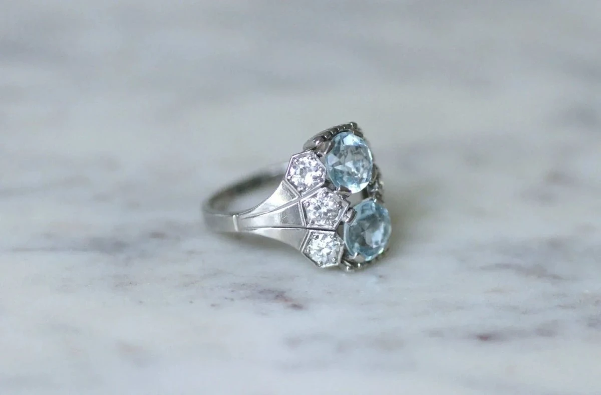Bague dôme Art Déco en platine (poinçon: chien) sertie en son centre de deux aigues-marines rondes pesant au total environ 2,00 Cts, et de diamants taillés à l’ancienne, dont le poids total est estimé à environ 1,15 Cts (Couleur estimée H, et pureté estimée VS à SI).