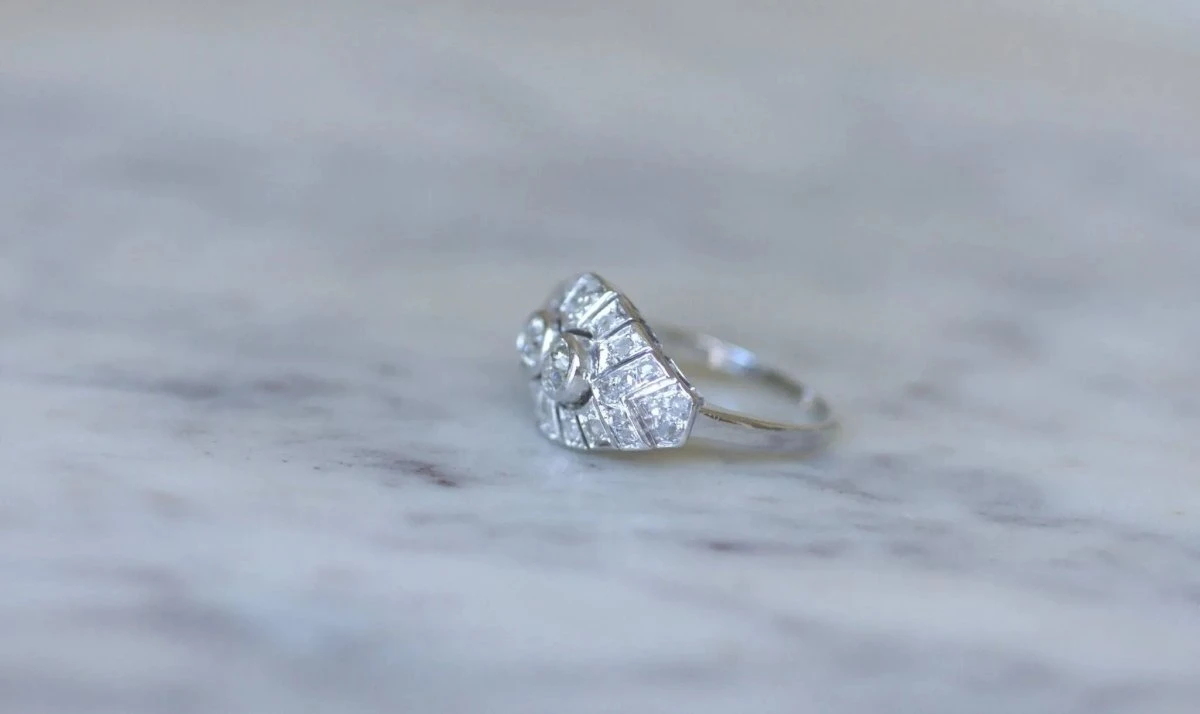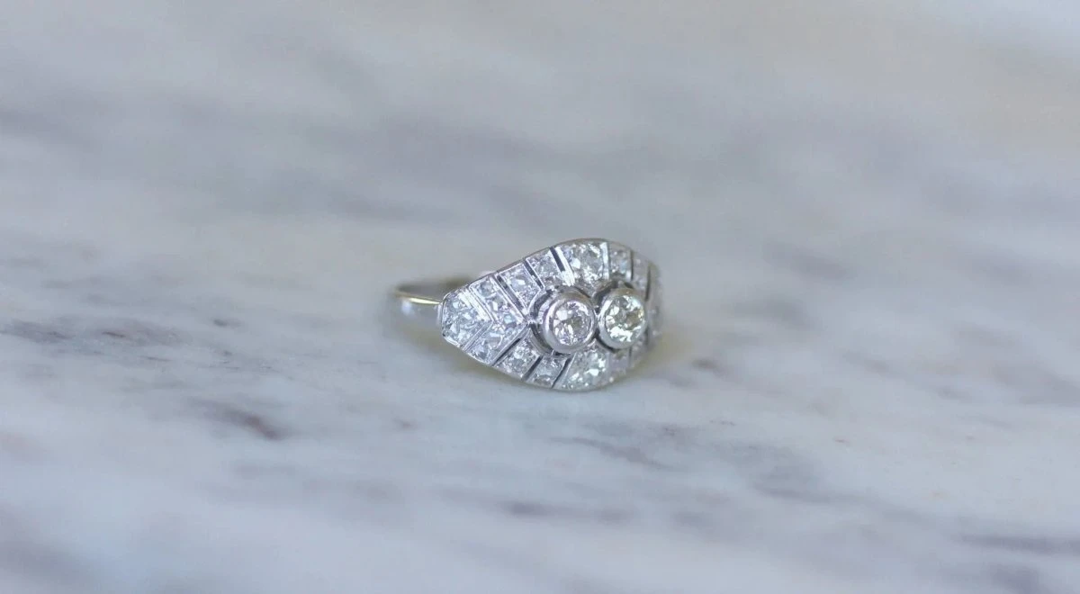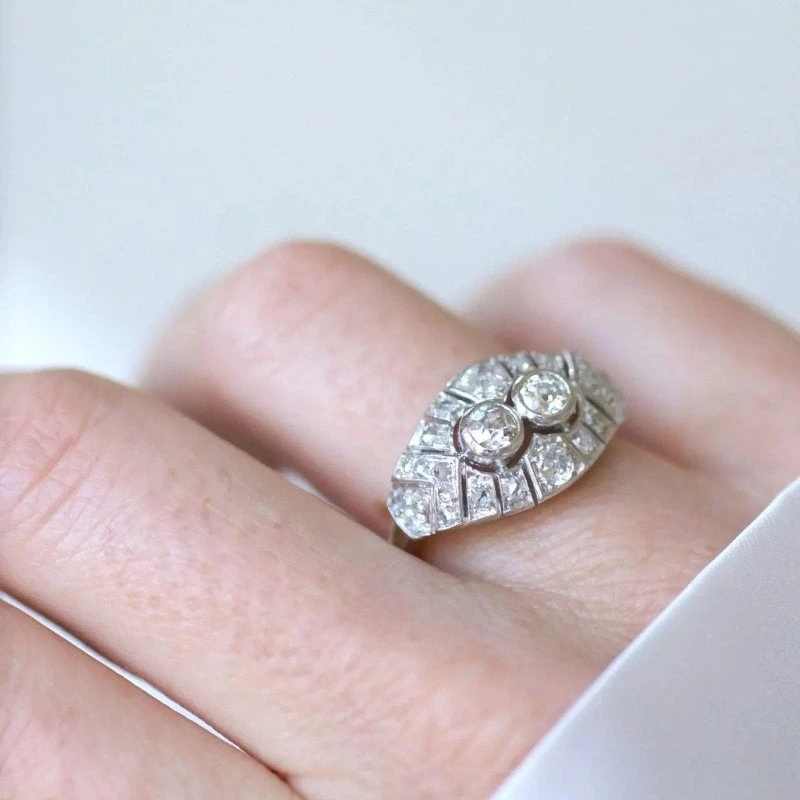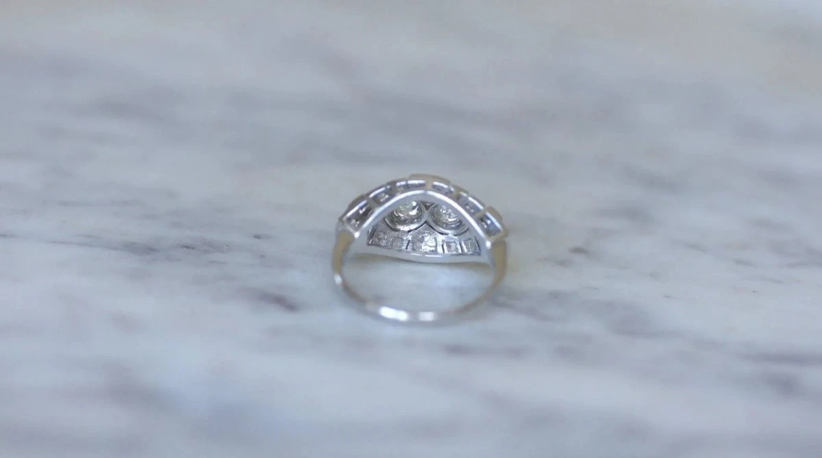 Bague dôme en platine (poinçon : mascaron), sertie en son centre de 4 diamants taillés à l’ancienne, dont le poids est estimé à environ 0,70 Ct (couleur estimée I à J, pureté estimée SI), dans un entourage de diamants taillés en rose dont le poids total est estimé à environ 0.15 Ct.