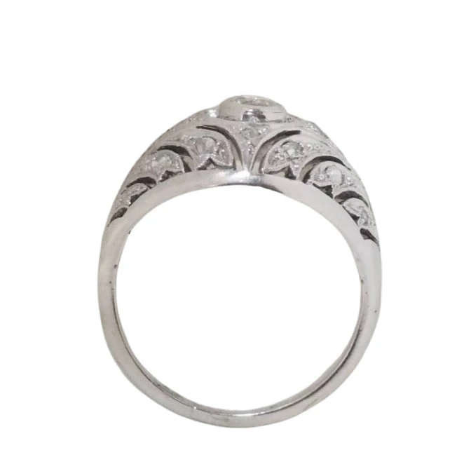Bague Dôme en or blanc 18 carats et platine 850, sertie au centre d’un diamant taille ancienne et d’un entourage de diamants taille rose.