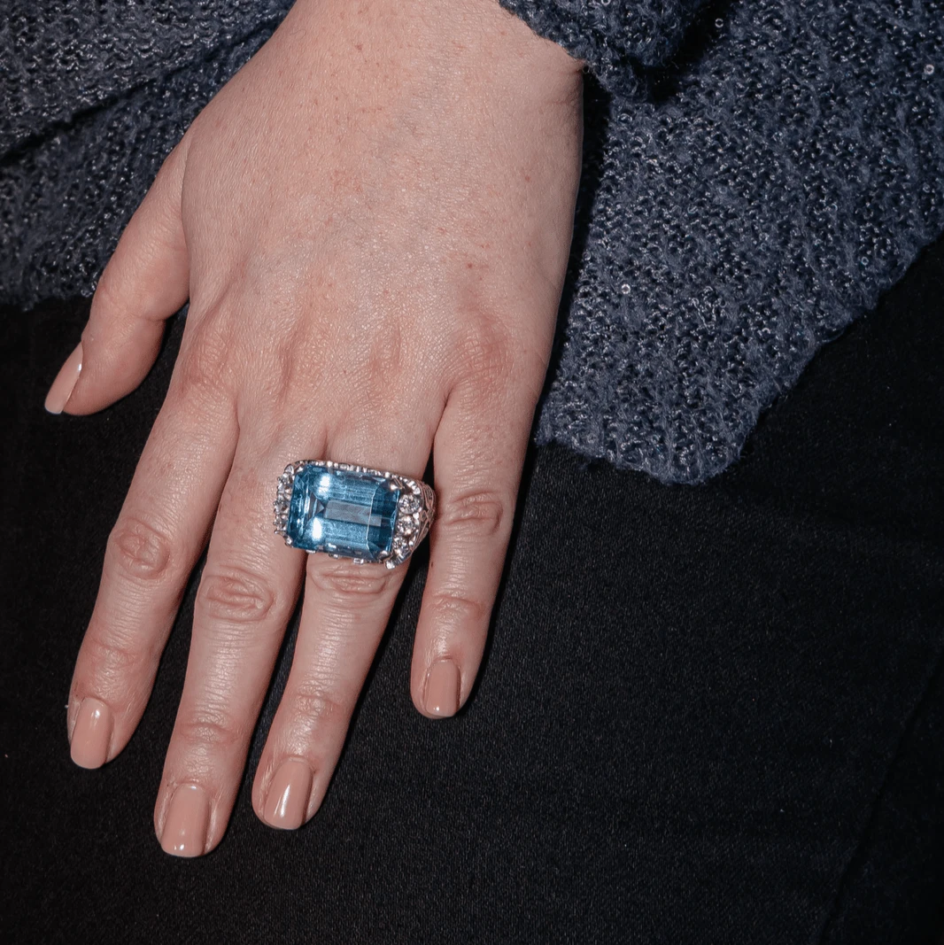 Bague en or blanc 750 millièmes (18 carats). sertie d’une aigue-marine et de diamants. une aigue-marine taille émeraude. d’un poids total d’environ 24.85 cts. certificat non traitée LFG. entourée de 56 diamants taille brillant. d’un poids total d’environ 0.98 ct. largeur sur le dessus : 1.70 cm. tour de doigt : 51. poids total : 27.22 g. poinçon hibou. excellent état