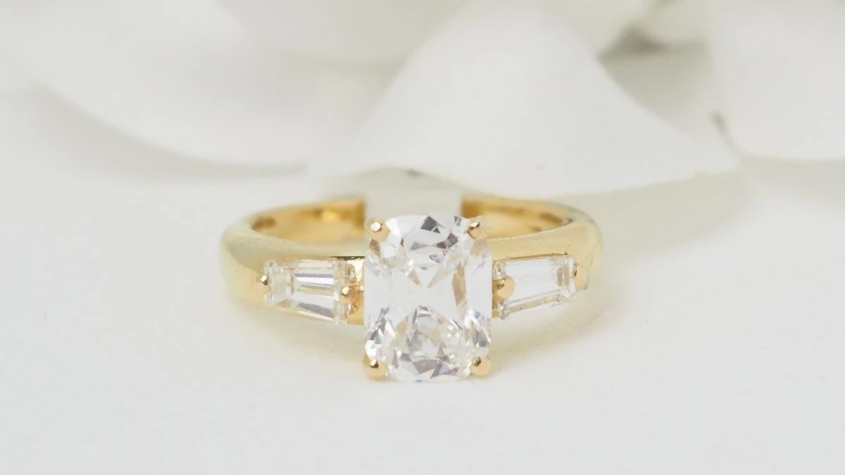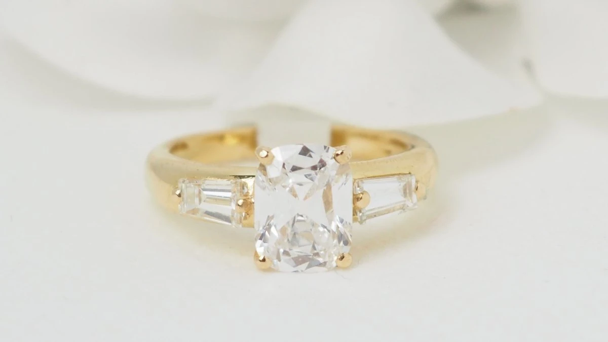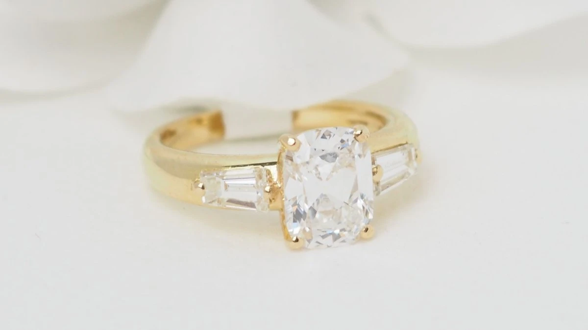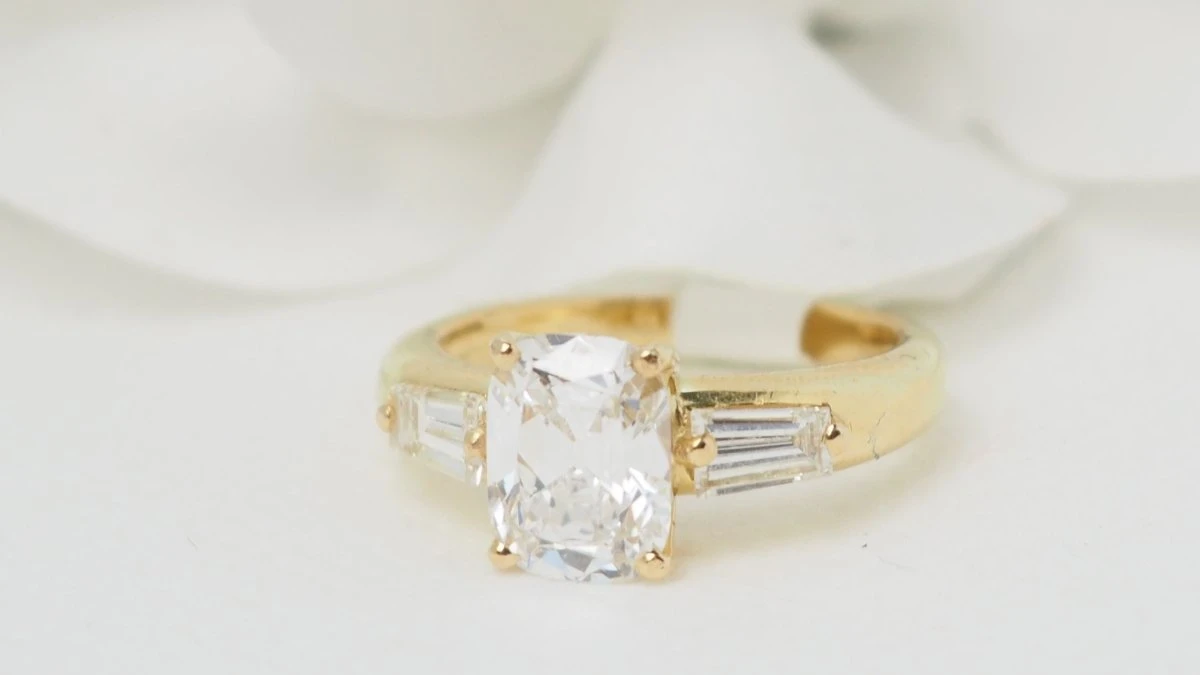 Bague En Or Jaune Et Diamant Coussin 2cts Certifié