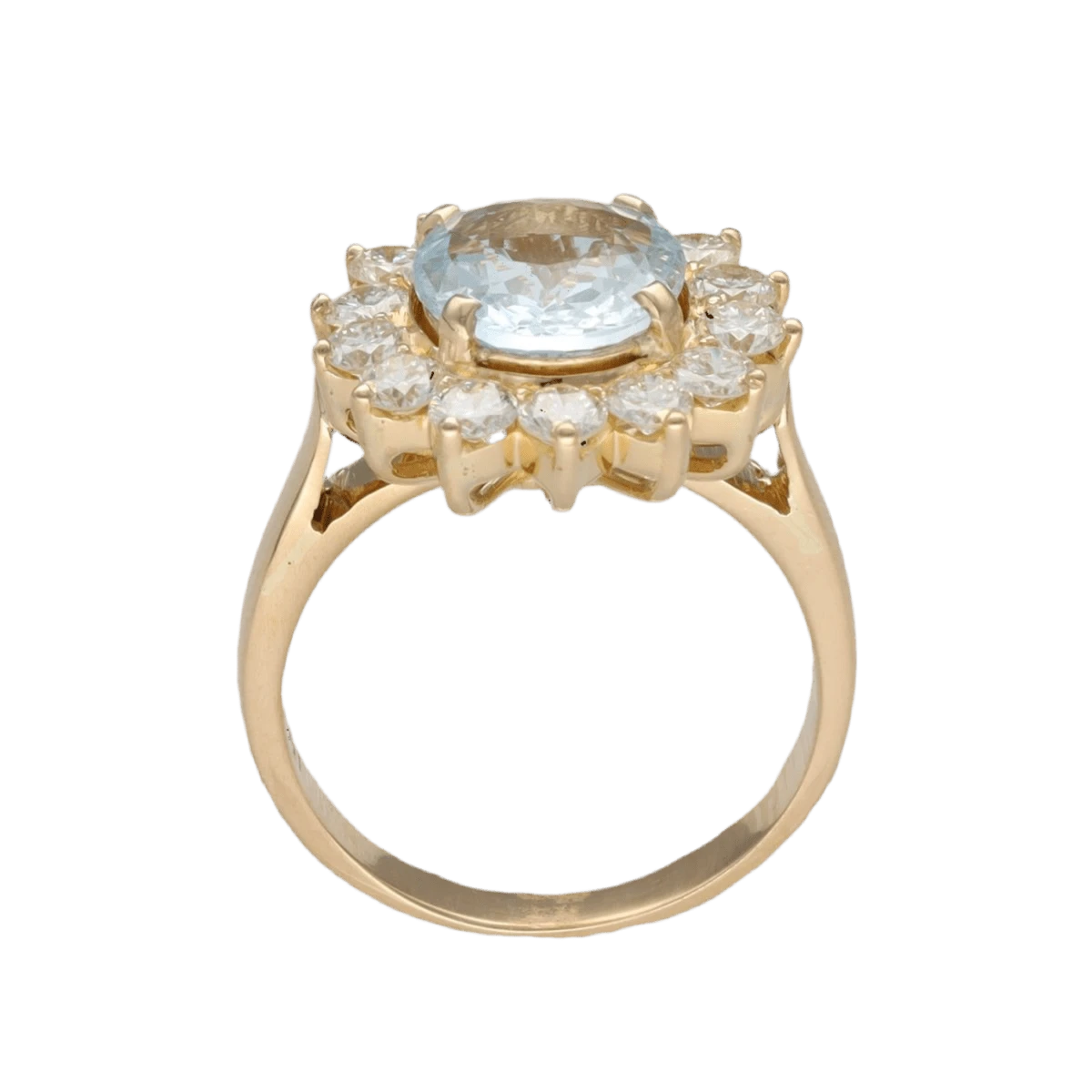 Bague en or jaune 18 carats sertie d’une aigue-marine ovale 2,37 carats, mise en valeur par un entourage de diamants taille brillant.