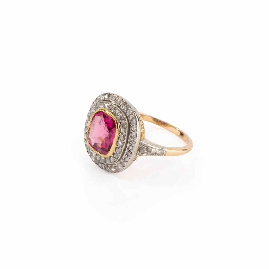 Bague en or jaune et platine sertie d’une tourmaline taille coussin et d’un double entourage de diamants taille rose.