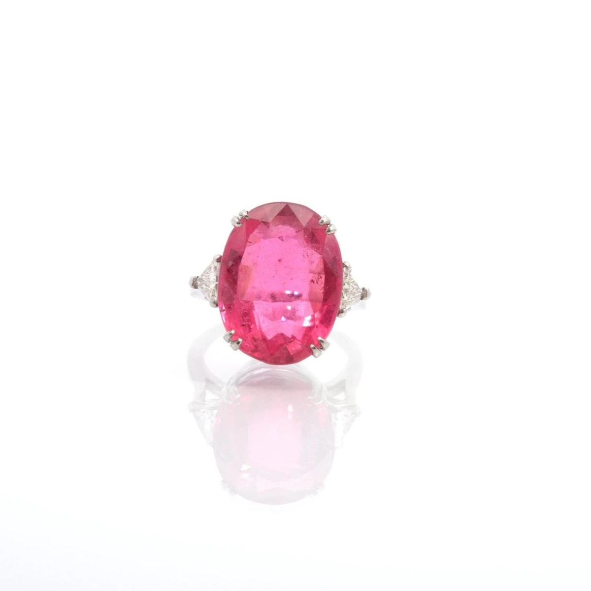 Bague Entourage en platine, sertie d’une tourmaline rose de 13,44 carats et de 2 diamants triangles