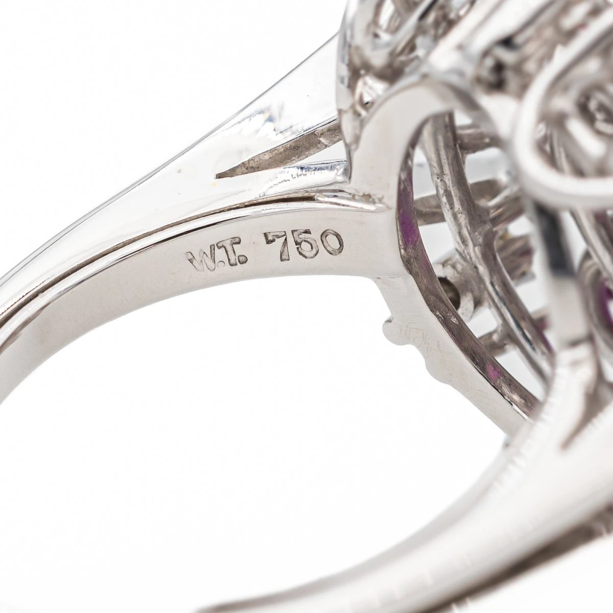 Bague en or blanc 750 millièmes (18 carats). motif fleur. sertie de 9 rubis taille ovale d’un poids total d’environ 3.15 cts (chaque rubis d’un poids d’environ 0.25 ct). entourés de 9 diamants taille marquise. d’un poids total d’environ 1.44 cts (chaque diamant d’un poids d’environ 0.16 ct) et de 5 diamants taille huit/huit. d’un poids total d’environ 0.10 ct (chaque diamant d’un poids d’environ 0.02 ct). dimensions de la fleur: 2.16 cm x 2.17 cm. épaisseur: 1.37 cm. tour de doigt: 52. poinçon tête d’aigle. poids total: 12.26 g. excellent état