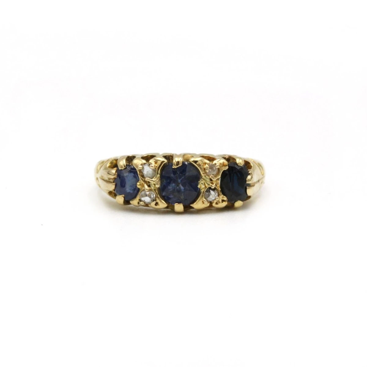 Bague Jarretière en or jaune 18 carats, sertie de 3 saphirs et de 4 diamants taillés en rose.