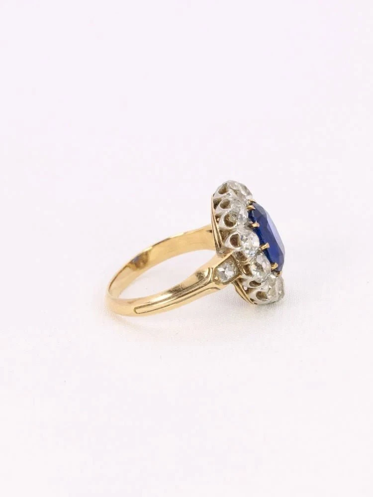 Bague Marguerite or rose 18 carats sertie en son centre d’un saphir coussin allongé Ceylan bleu intense non chauffé pesant 1,72 carats (8.91×5,64×3,47mm) dans un entourage de diamants taille ancienne pour un poids total d’environ 1,5 carats de qualité GH SI. Travail probablement français de la fin du 19ème siècle.