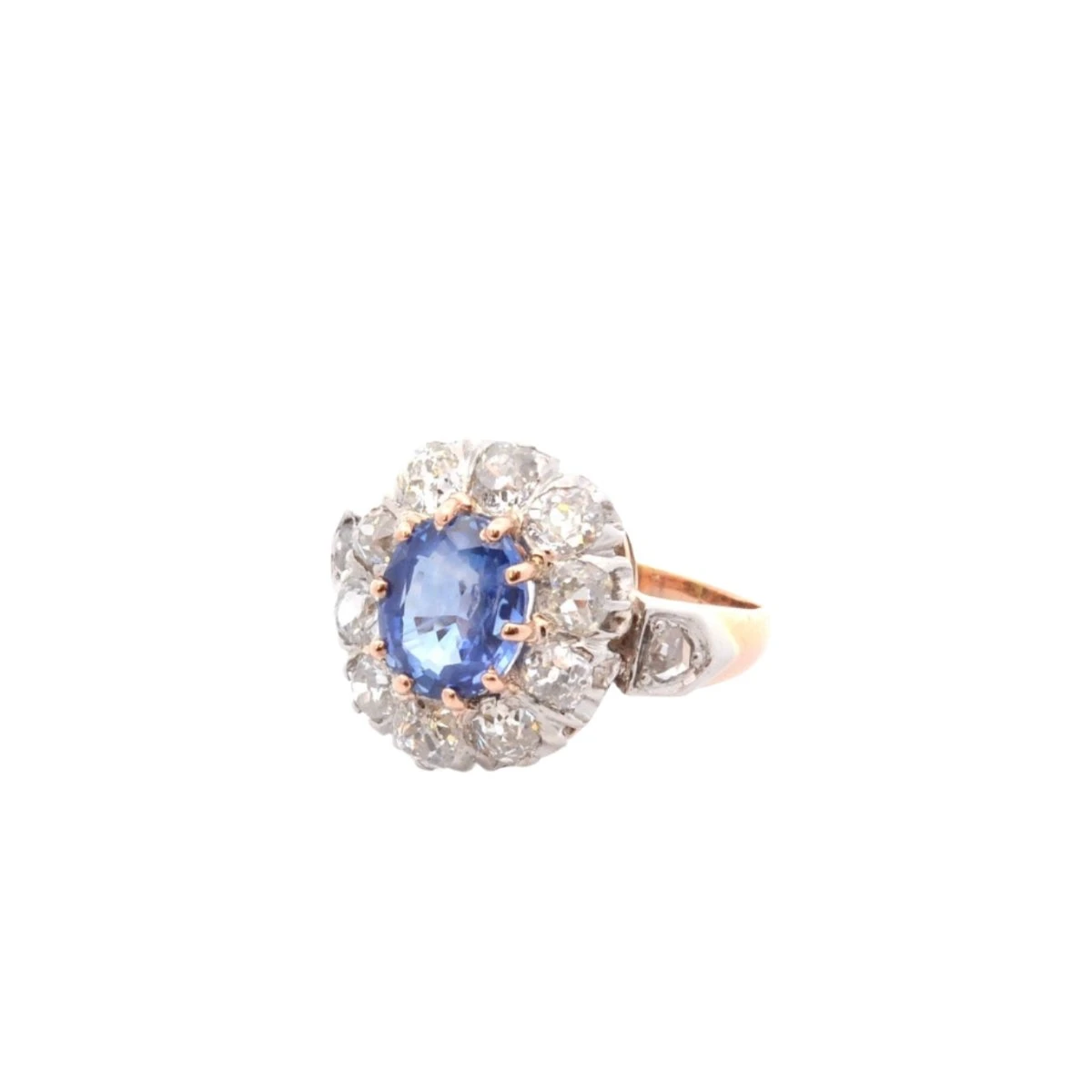 Bague Marguerite en platine, or blanc 18 carats sertie d’un saphir de 2.09 carats et de 10 diamants taille ancienne 1.5 carats et 2 diamants taille rose 0.20 carat.