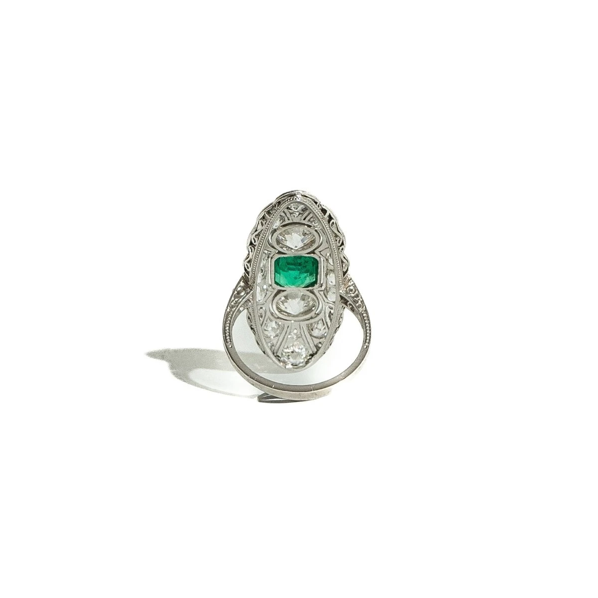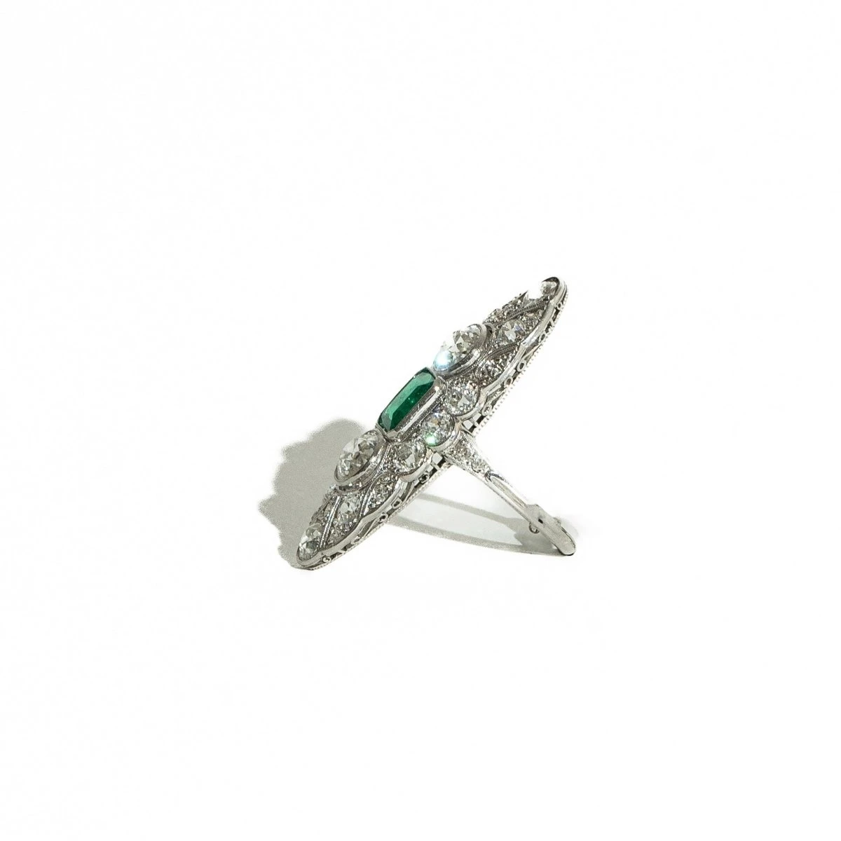 Bague marquise en platine et diamants, sertie au centre d’une émeraude . Vers 1920 .