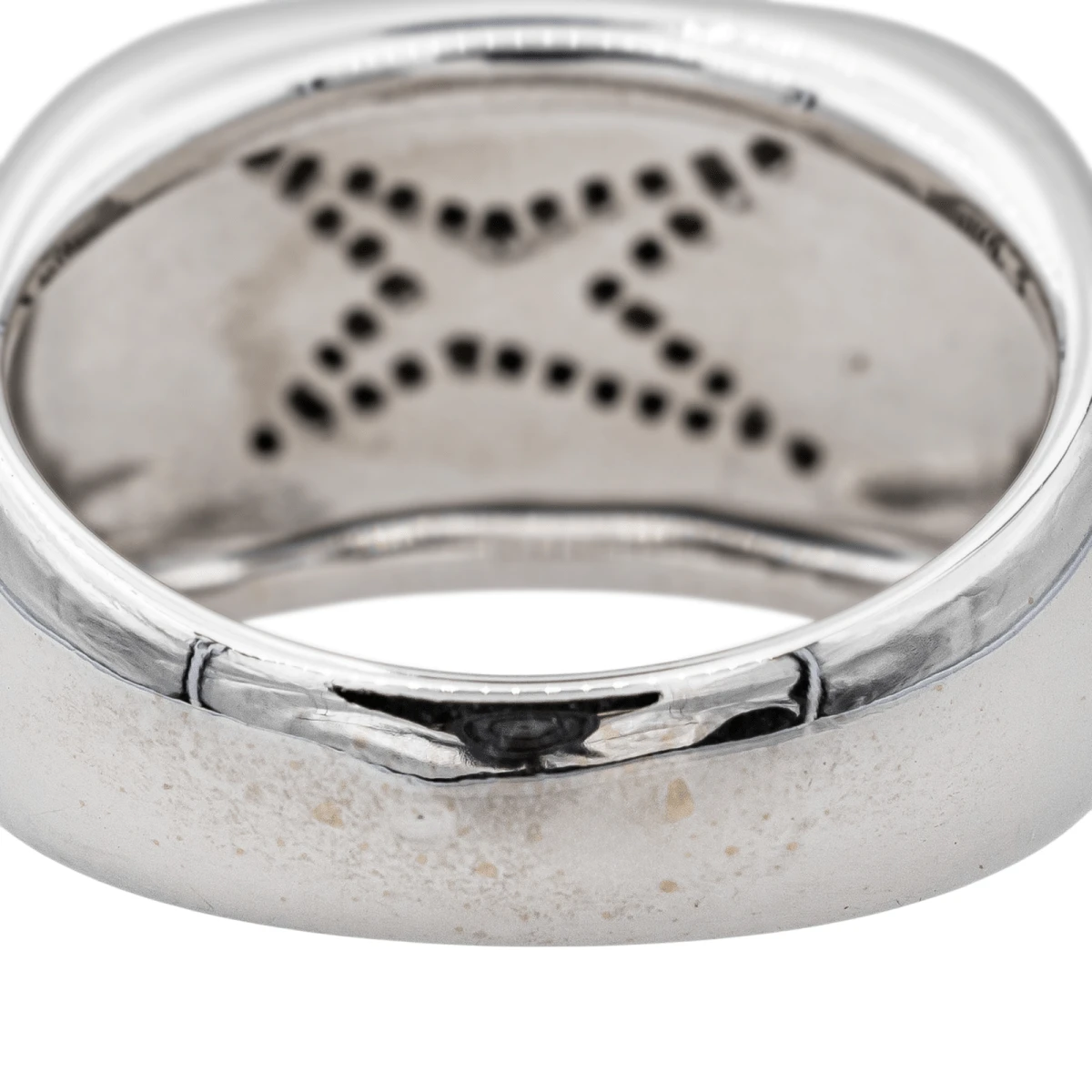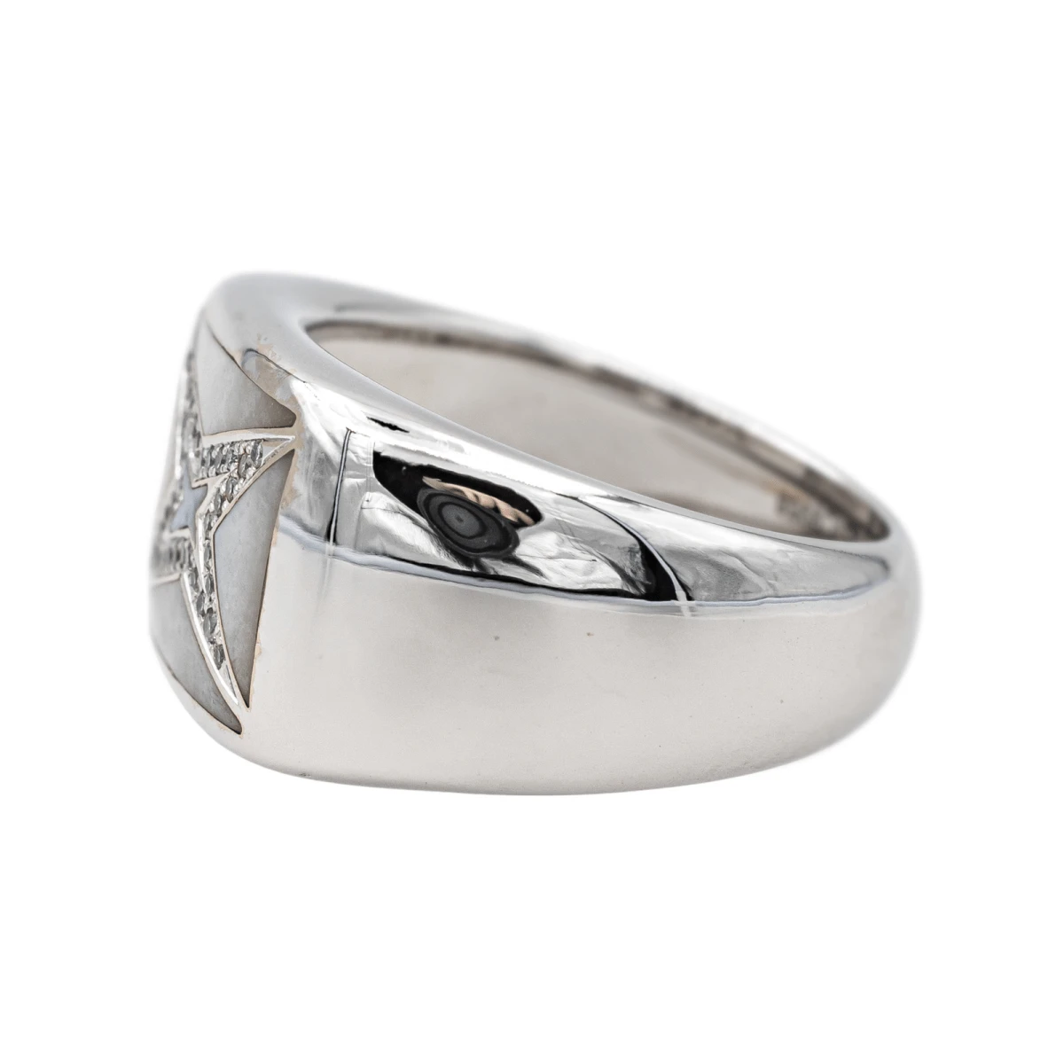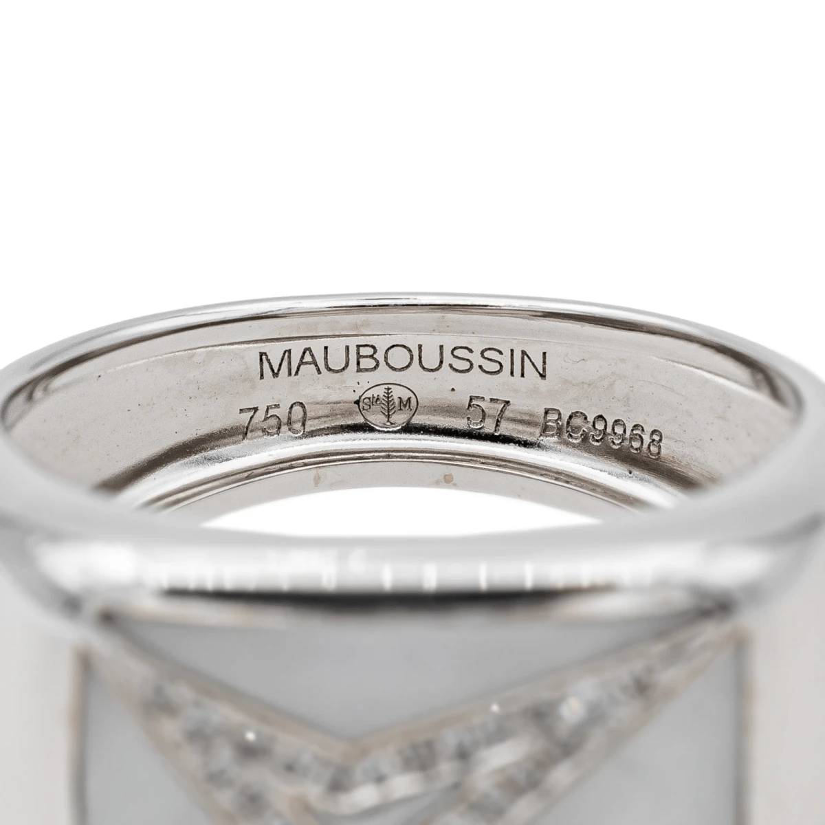 Bague signée de la Maison Mauboussin en or blanc 750 millièmes (18 carats). modèle Grande vie. sertie de nacre et de diamants. taille brillant. d’un poids total d’environ 0.17 ct. (chaque diamant d’un poids d’environ 0.005 ct). largeur sur le dessus : 1.24 cm. tour de doigt : 57. poids total : 9.00 g. poinçon hibou. numérotée. excellent état