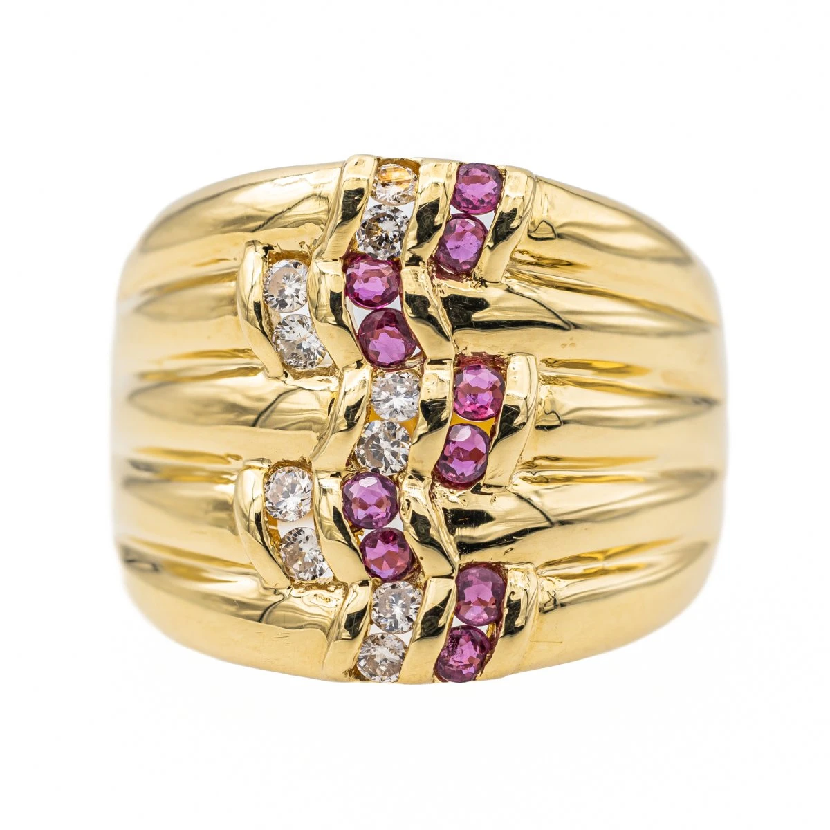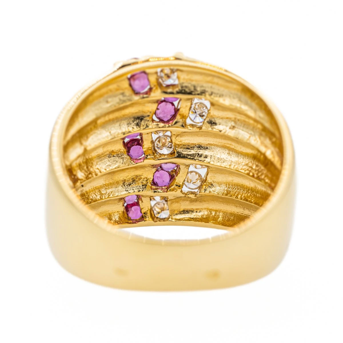 Bague en or jaune 750 millièmes (18 carats). sertie de rubis et de diamants. 10 rubis taille rond. d’un poids total d’environ 0.30 ct. (chaque rubis d’un poids d’environ 0.03 ct). 10 diamants taille brillant. d’un poids total d’environ 0.30 ct. (chaque diamant d’un poids d’environ 0.03 ct). largeur sur le dessus : 1.65 cm. tour de doigt : 54. poids total : 8.24 g. poinçon tĂŞte d’aigle. excellent Ă©tat