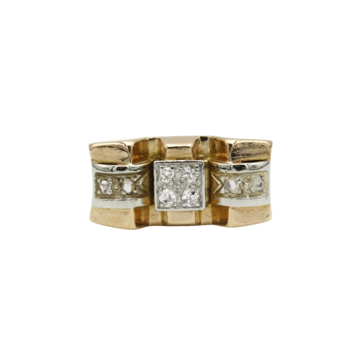 Bague Tank des années 40-50, en or jaune et blanc 750‰, sertie au centre de 4 diamants taille ancienne de 0,02 carat chacun, épaulés par 4 diamants taille rose.