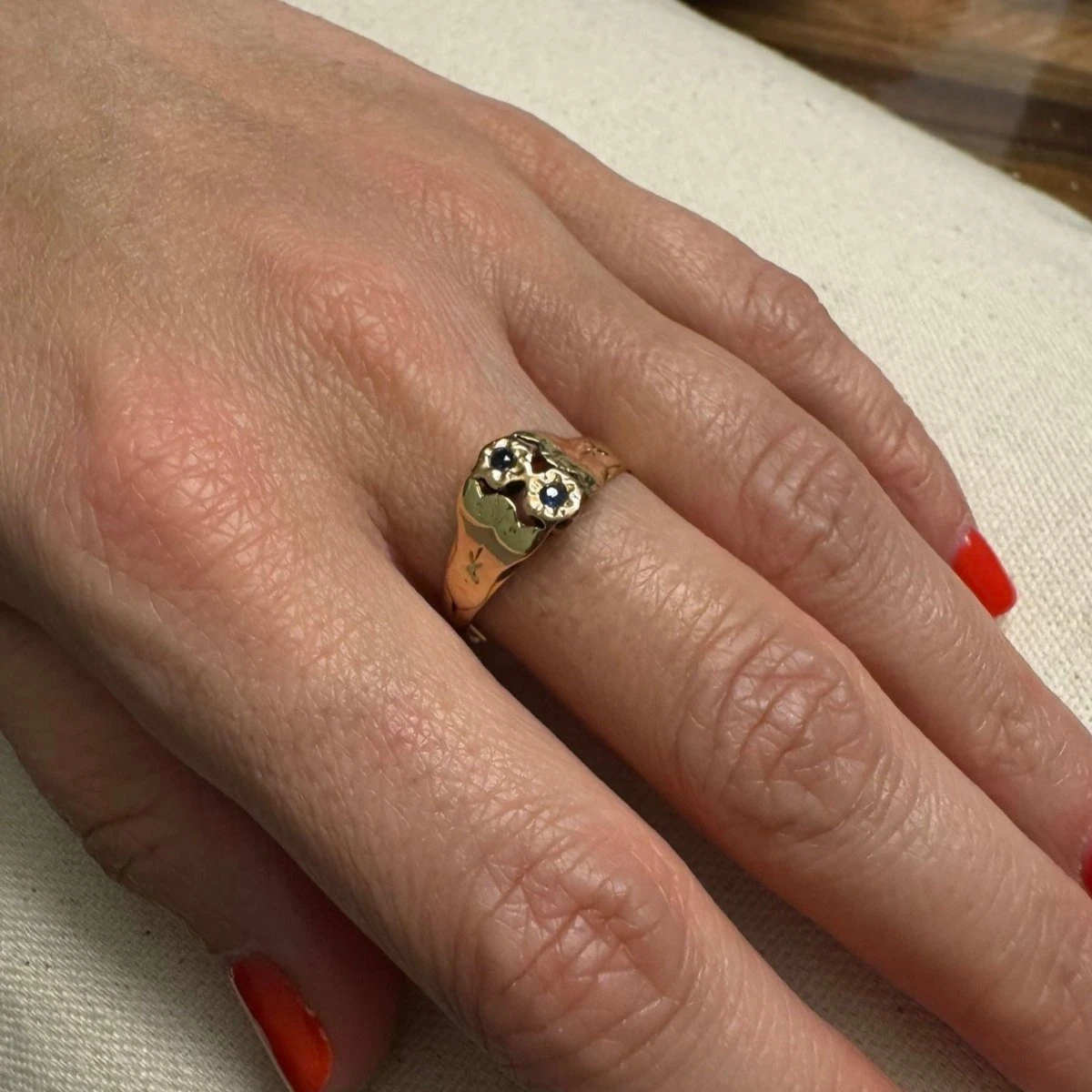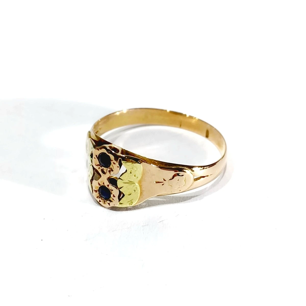 Bague Toi et Moi en or rose et jaune 18 carats ornée de deux saphirs sur le dessus.