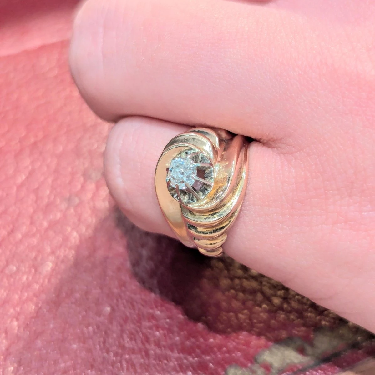 Bague Tourbillon en or rose 18 carats et diamant central taille ancienne.Â