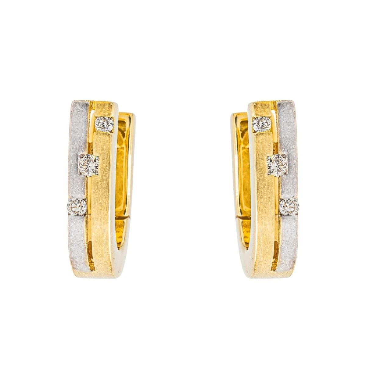 Paire de boucles d’oreilles créoles en or blanc et jaune 750 millièmes (18 carats). sertie de 3 diamants. taille brillant. d’un poids total d’environ 0.06 ct. (chaque diamants d’un poids d’environ 0.01 ct. dont le diamant central 0.04 ct). dimensions : 1.63 cm x 0.43 cm. poids total : 6.71 g. poinçon tête d’aigle. excellent état