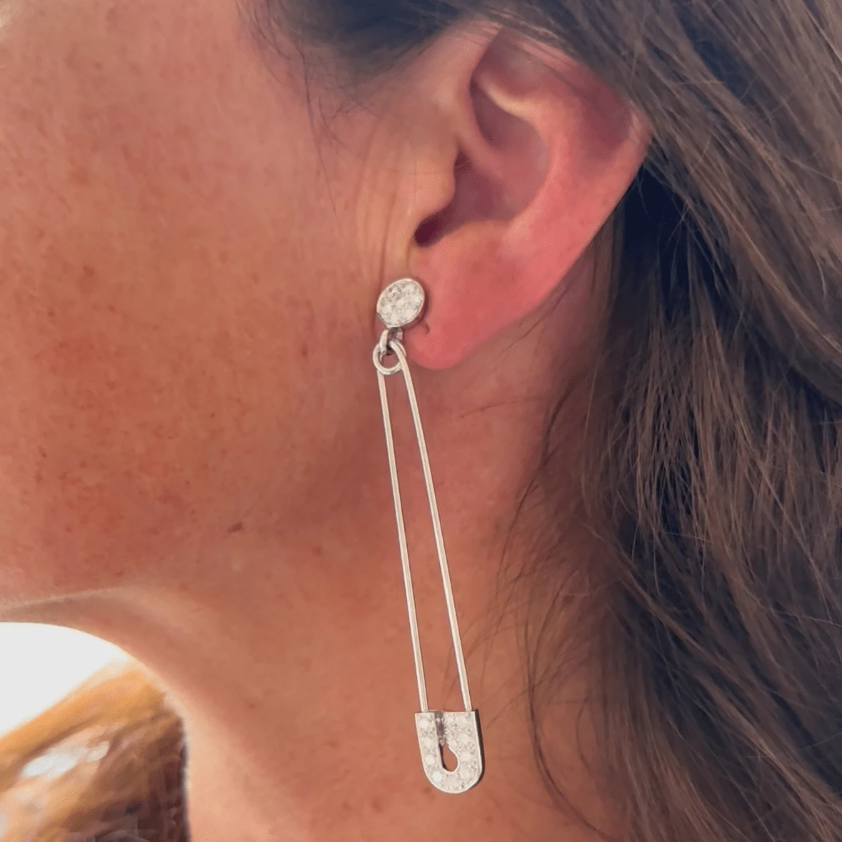 Boucles d’oreilles CHANEL en or blanc 18 carats reprenant la forme d’une épingle à nourrice. Chaque boucle est délicatement pavée de diamants