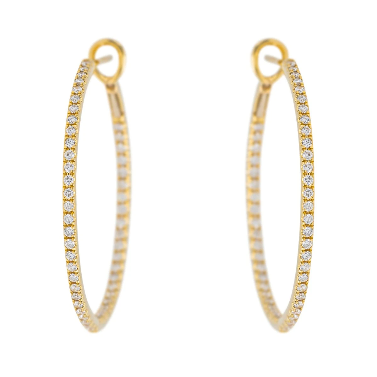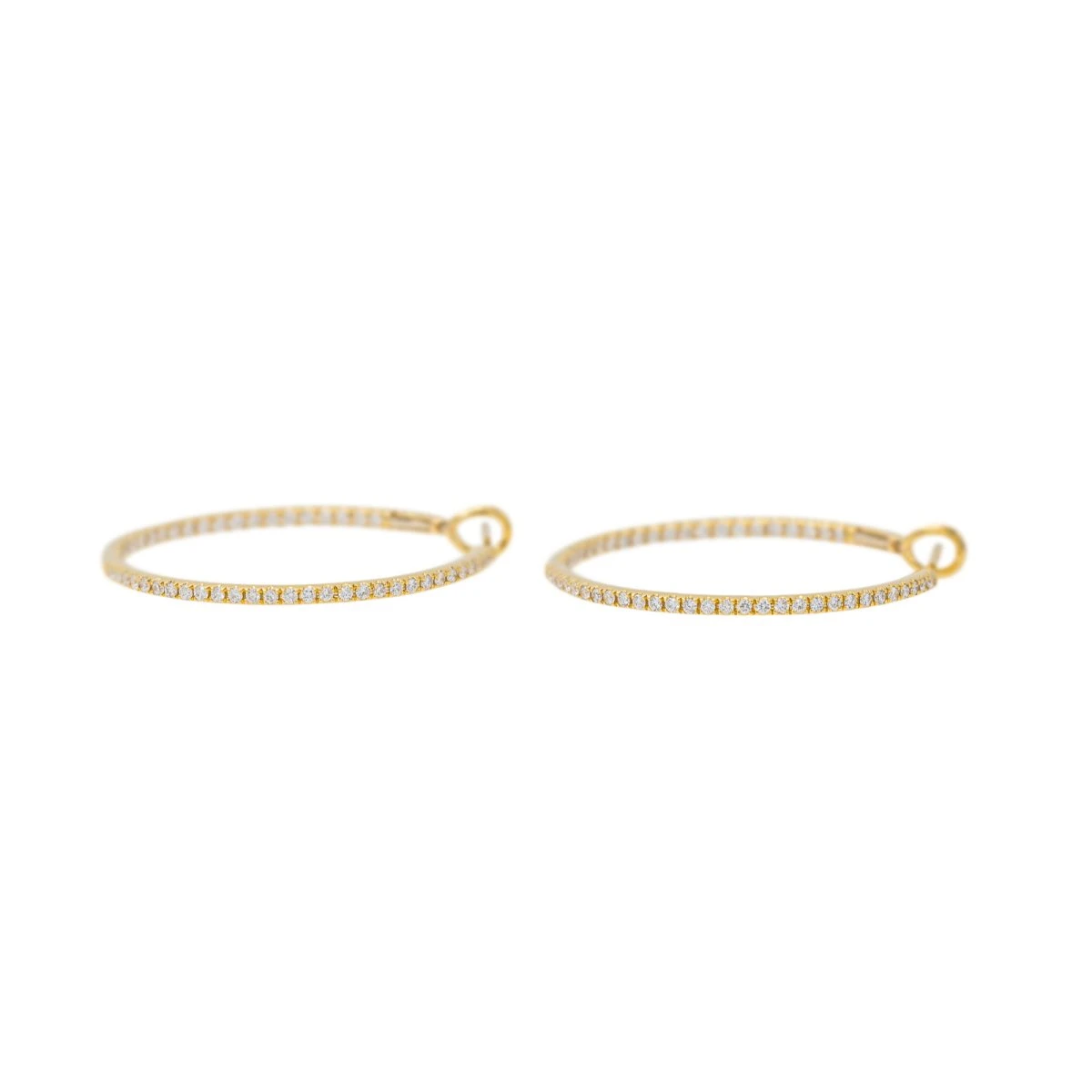 Créoles diamants en or jaune 750 millièmes (18 carats) testé. serties de 96 diamants au total. taille brillant. pour un total de 0.85 ct. pavage tour complet (demi interieur et demi extérieur). diamètre : 3 cm. largeur : 0.17 cm. poids total : 5.09 ct. jamais portées. excellent état