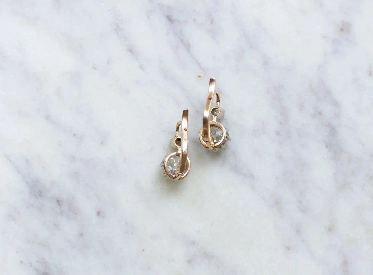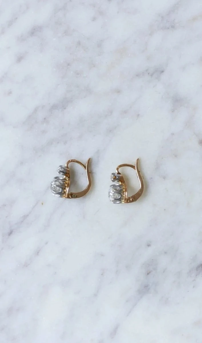 Boucles d’oreilles dormeuses en or rose 18kt et platine (poinçon tête d’aigle) ornées de diamants taillés à l’ancienne, pesant au total environ 1,10 Ct (couleur estimée I / Pureté estimée VS), surplombées de deux petits diamant taillés à l’ancienne, dont le poids total est estimé à environ 0,10 Ct.