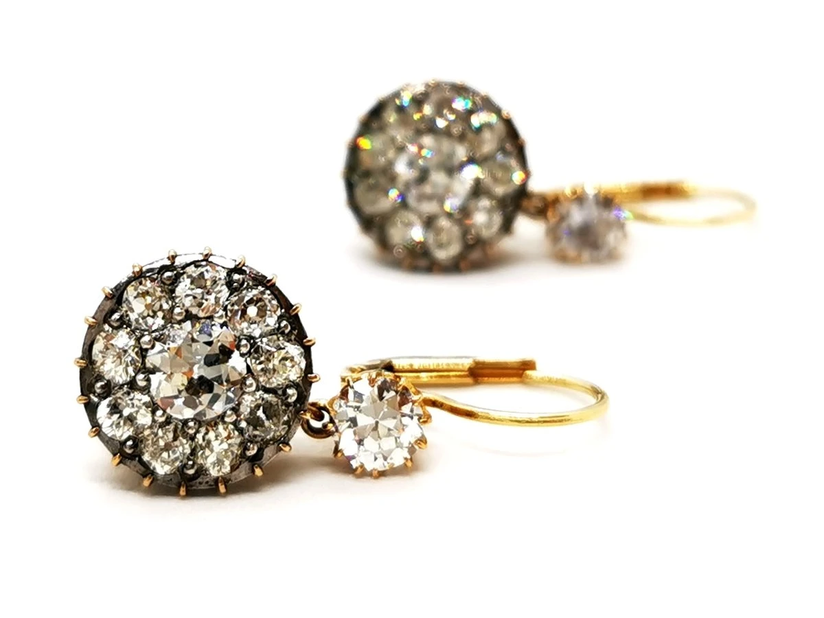 Boucles d’oreilles dormeuses serties de diamants. en or jaune et blanc 750 millièmes (18 carats). 22 diamants taille brillant. pour un poids total d’environ 3.76 cts. dimensions: 3.08 cm x 1.29 cm. poids total: 5.73 g. excellent état