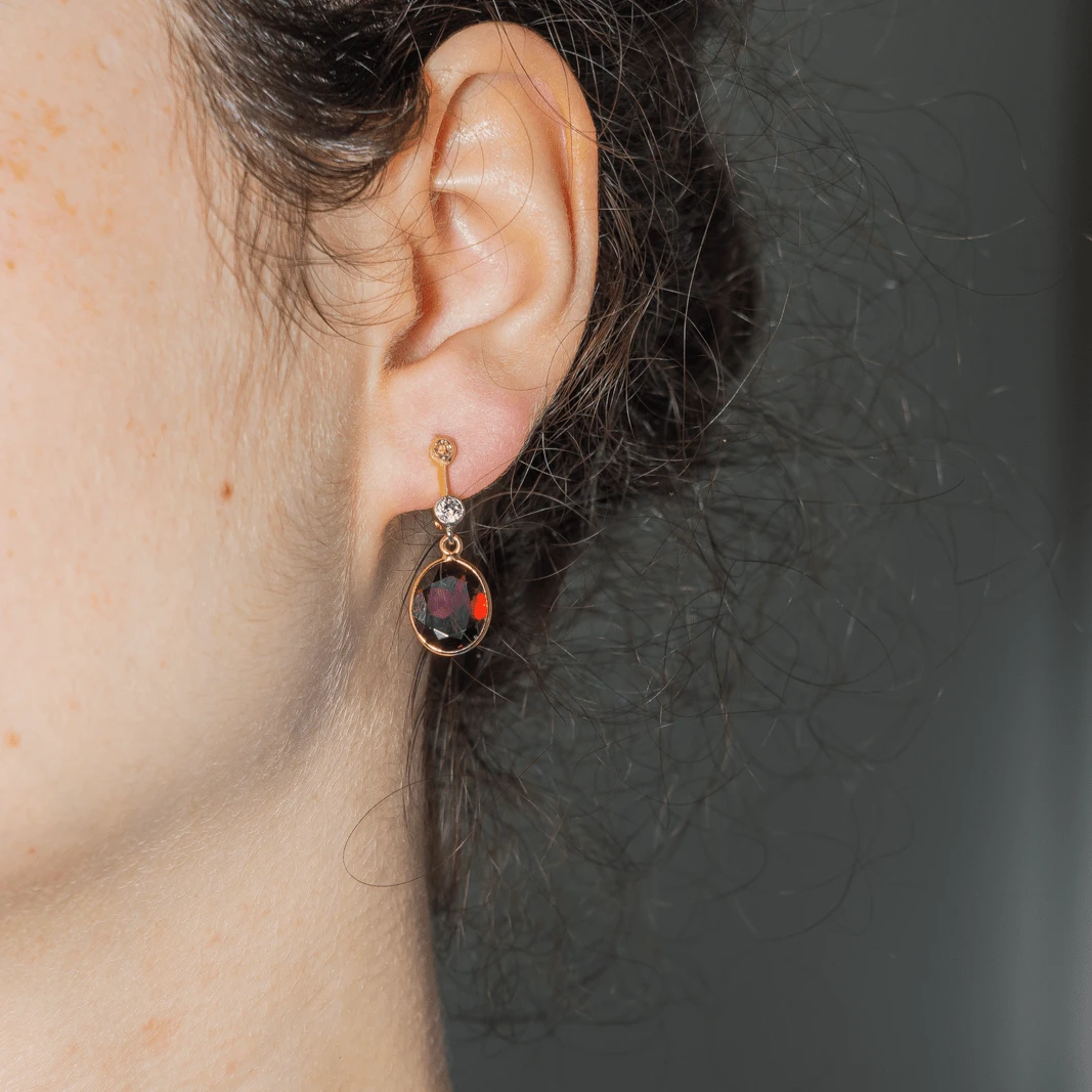 Boucles D’oreilles Dormeuses En Or Jaune, Or Blanc, Platine, Grenats Et Diamants