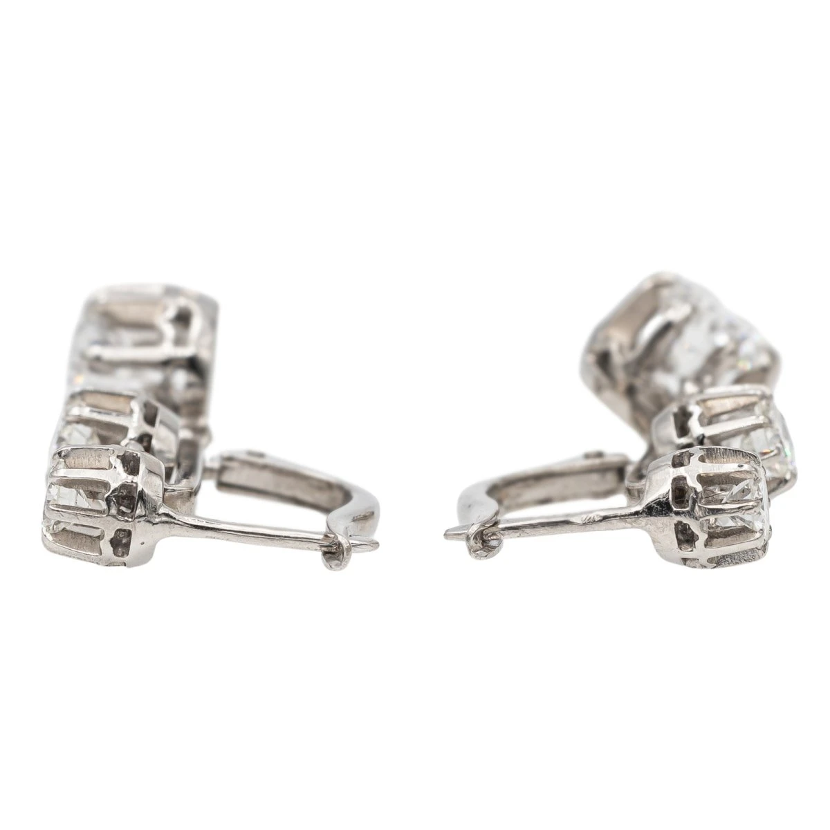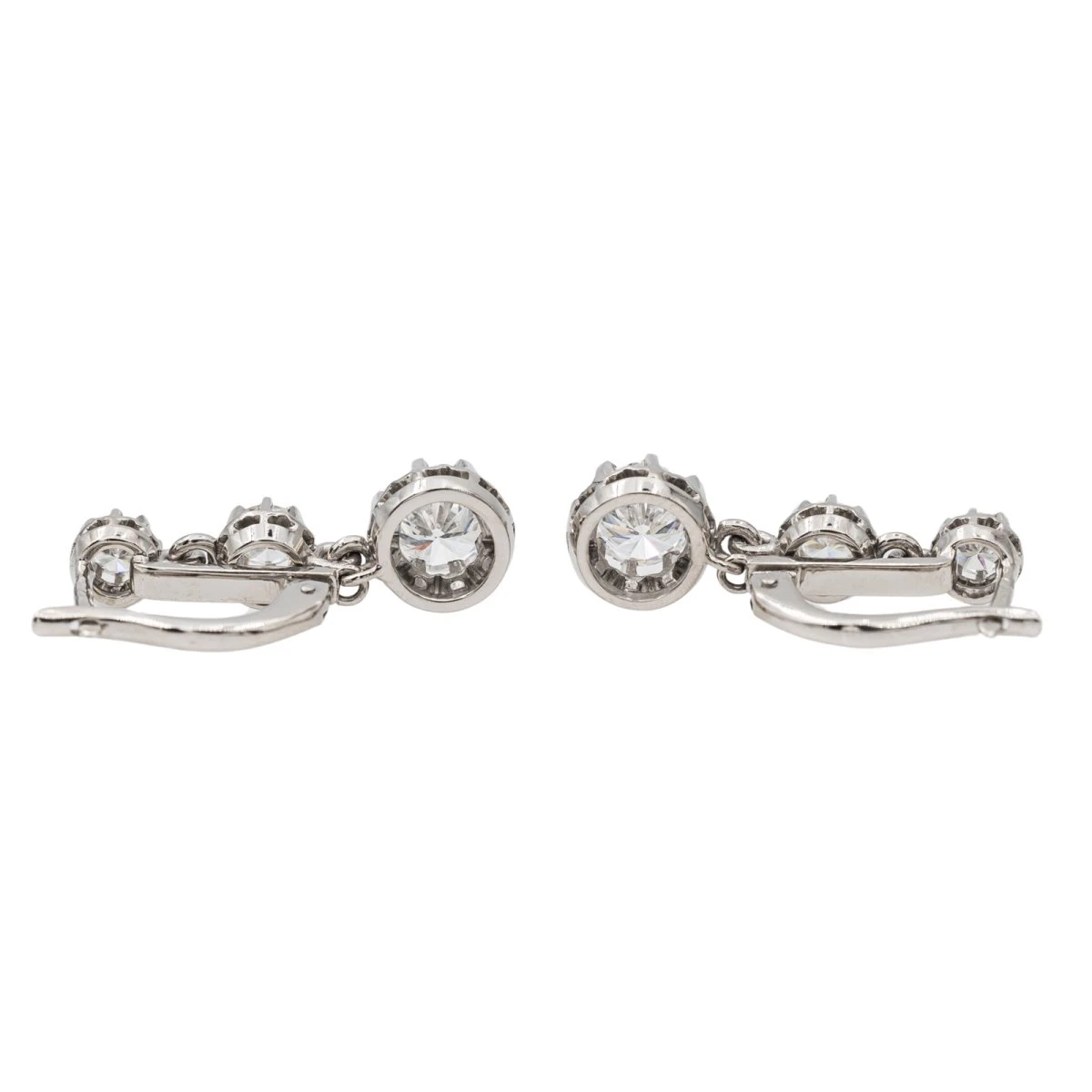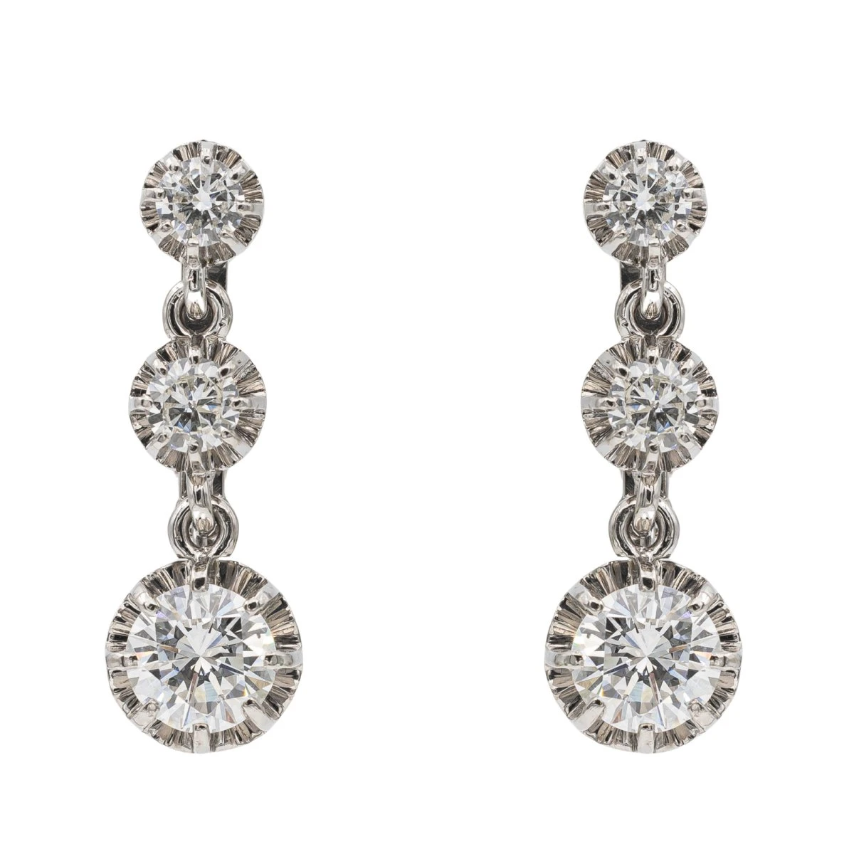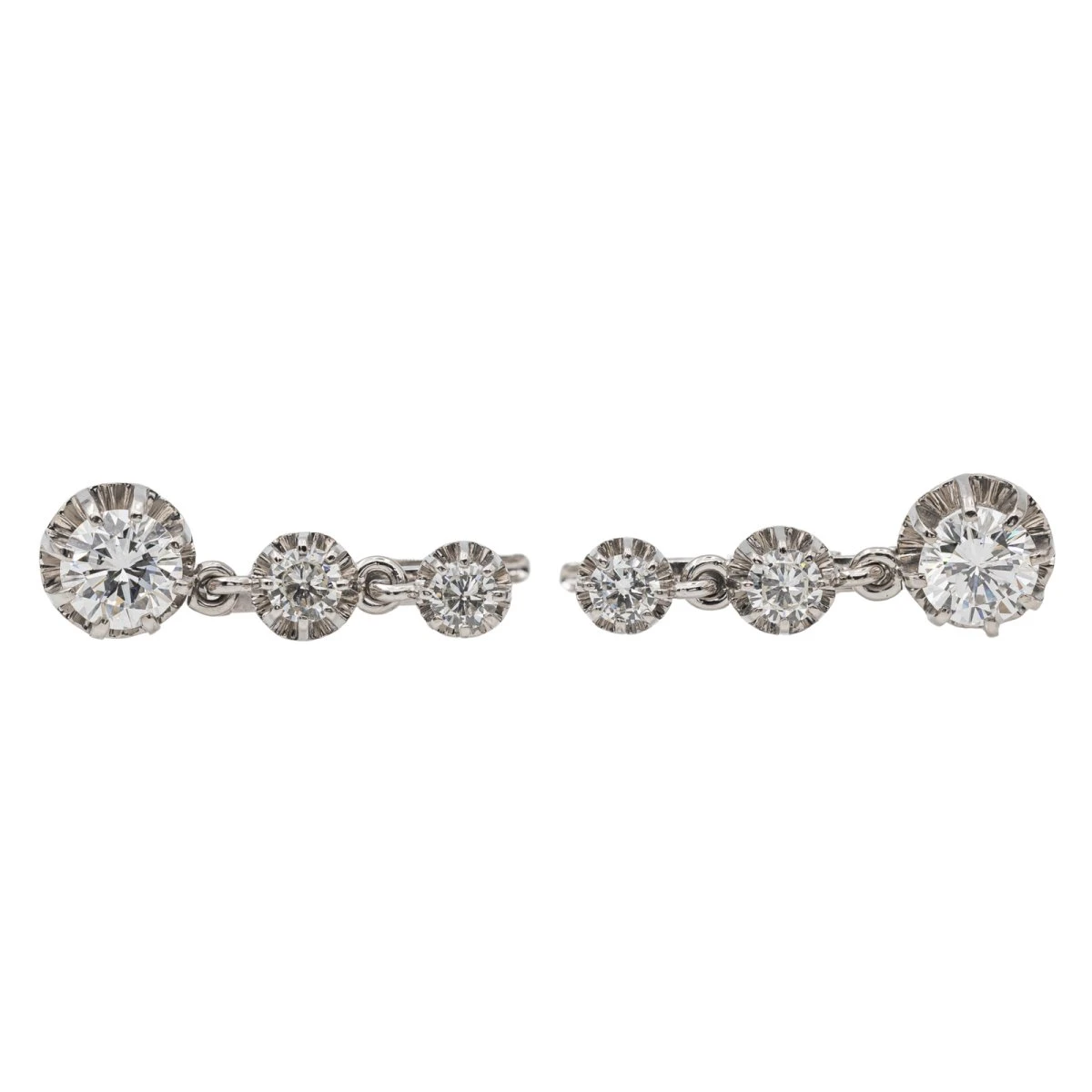 Boucles d’oreilles dormeuses en or blanc 750 millièmes (18 carats). serties chacune de 3 diamants taille brillant. dont un d’environ 0.80 ct. un d’environ 0.14 ct et un de 0.11 ct. Poids total estimĂ© des diamants : 2.10 cts. Dimensions : 2.47 x 0.80 cm. Poids total: 7.23 g. Poinçon tĂŞte d’aigle. Excellent Ă©tat