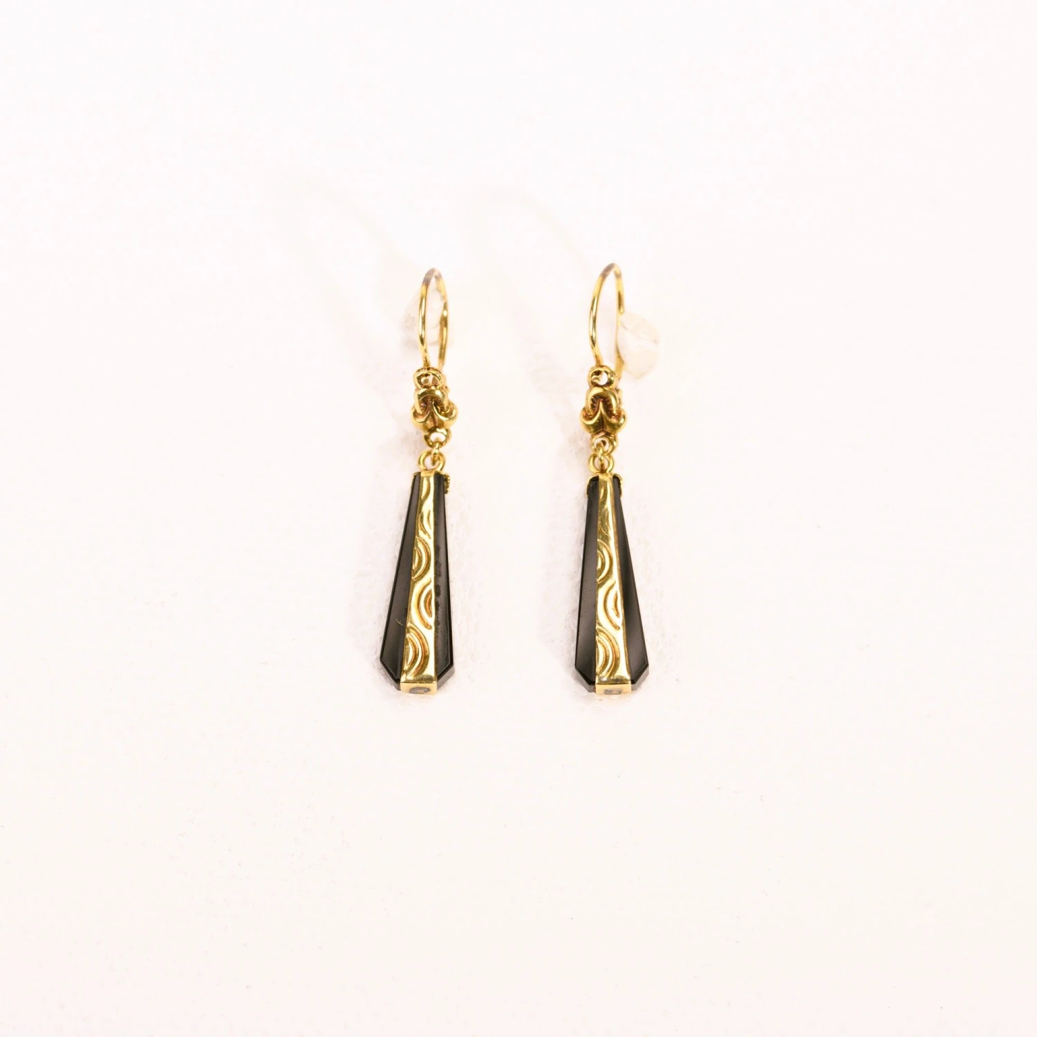 Paire de boucles d’oreilles dormeuses pendantes en or jaune 585/1000 (14K) et onyx taillés en trapèze à pans coupés. Système de fermeture à brisure par l’arrière.