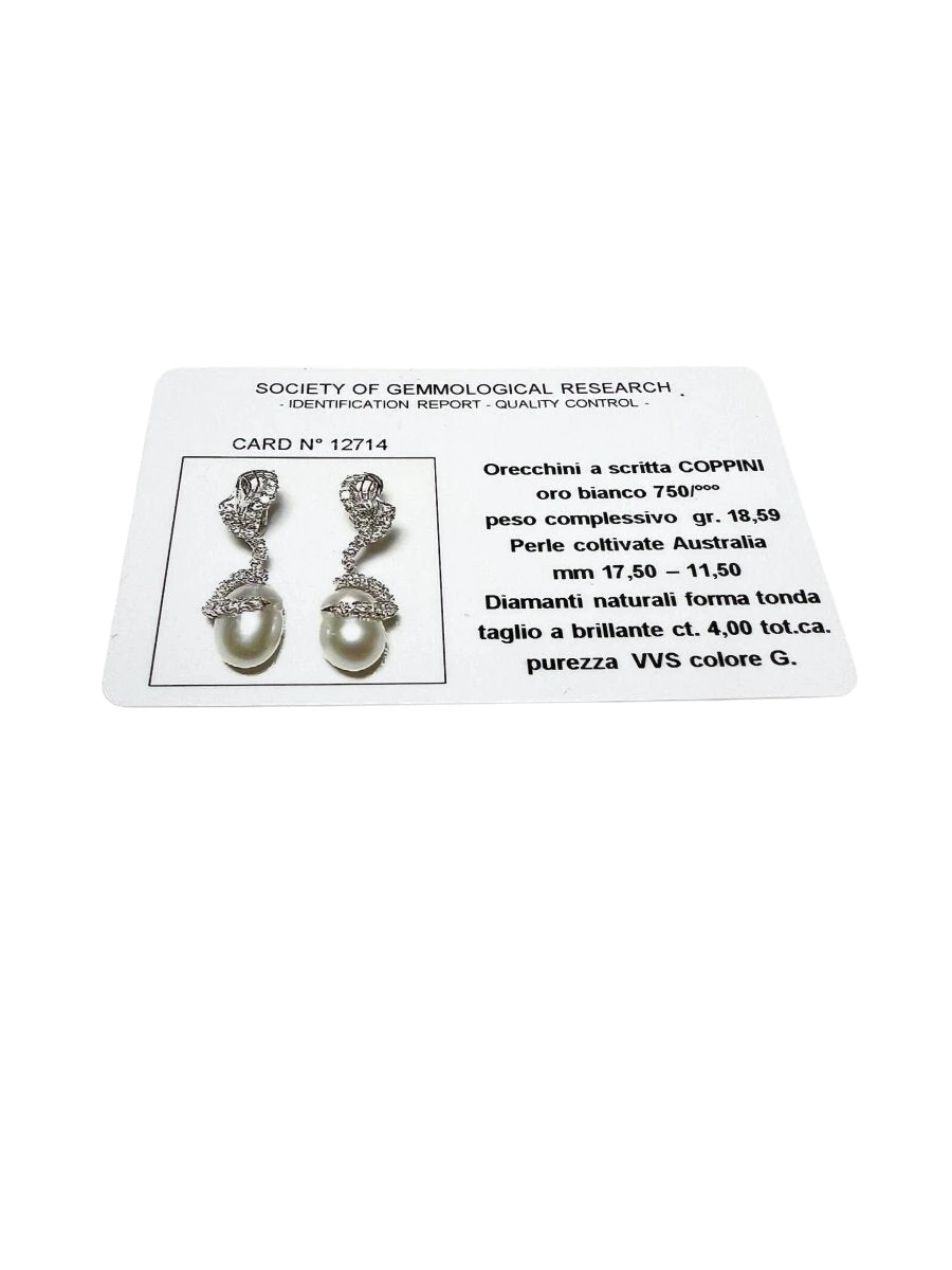 Boucles d’oreilles en or blanc 18 carats (750 ‰) de 18,59 grammes avec des diamants naturels taillés en brillant pour un total de 4,00 carats ; pureté VVS, couleur G, et des perles de culture australiennes de 17,50 mm x 11,50 mm, marquées COPPINI. Elles mesurent 14,50 mm de largeur, 45,13 mm de hauteur et ont une épaisseur de 10,50 mm.