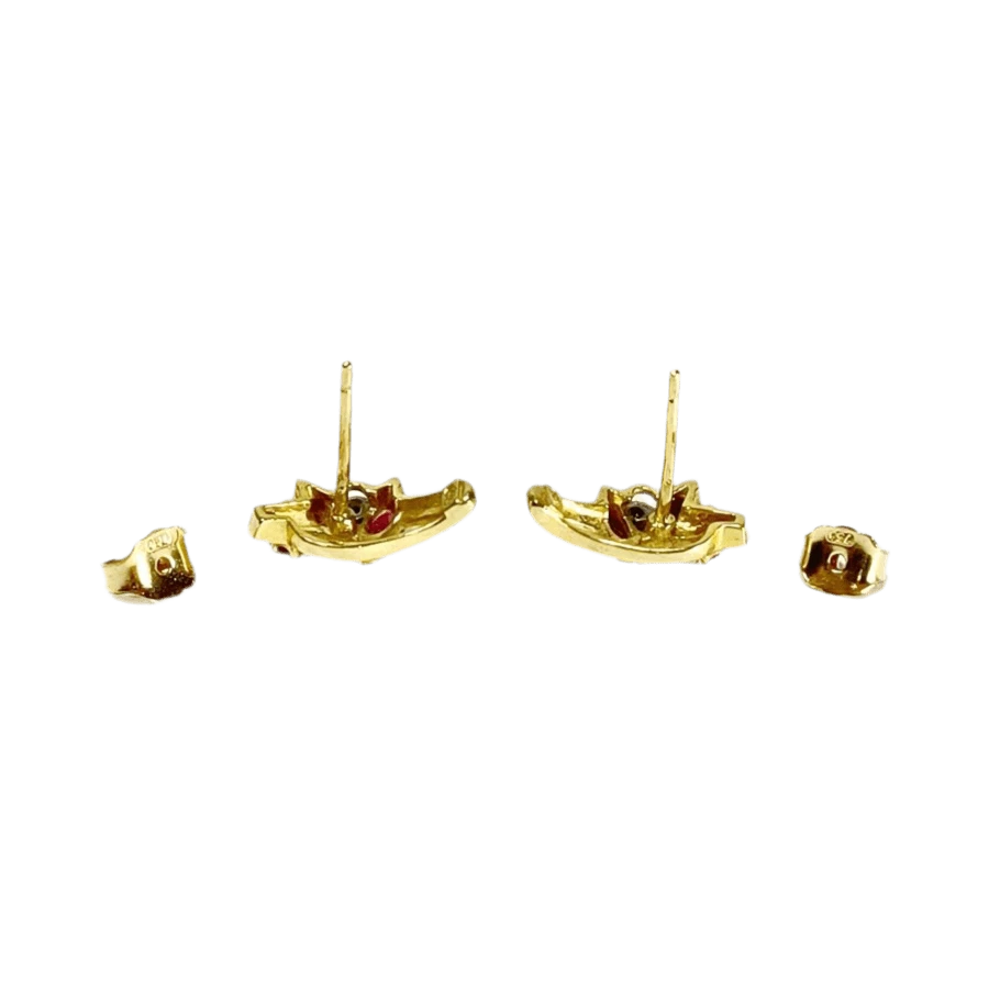 Boucles d’oreilles en or jaune 18 carats ornée d’un diamant et 3 rubis. Les fermoirs sont des systèmes poussettes également en or.