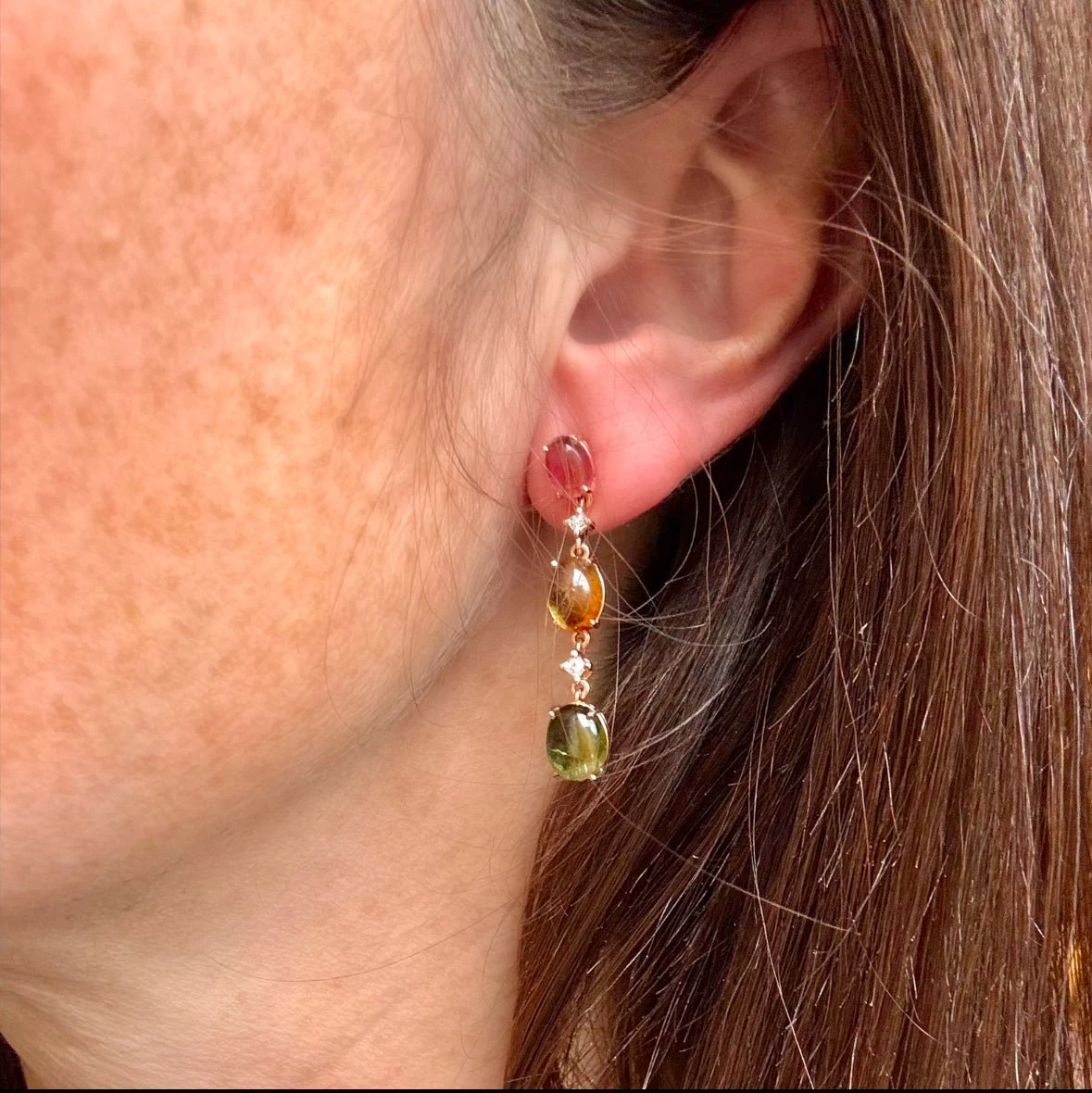 Jolie paire de boucles d’oreilles en or rose 18 carats sertie de trois tourmalines ovales taille cabochon en chute (d’environ 0,82 carats pour les plus petites rose, à environ 1,83 carats pour les grandes, vertes, poids estimés).