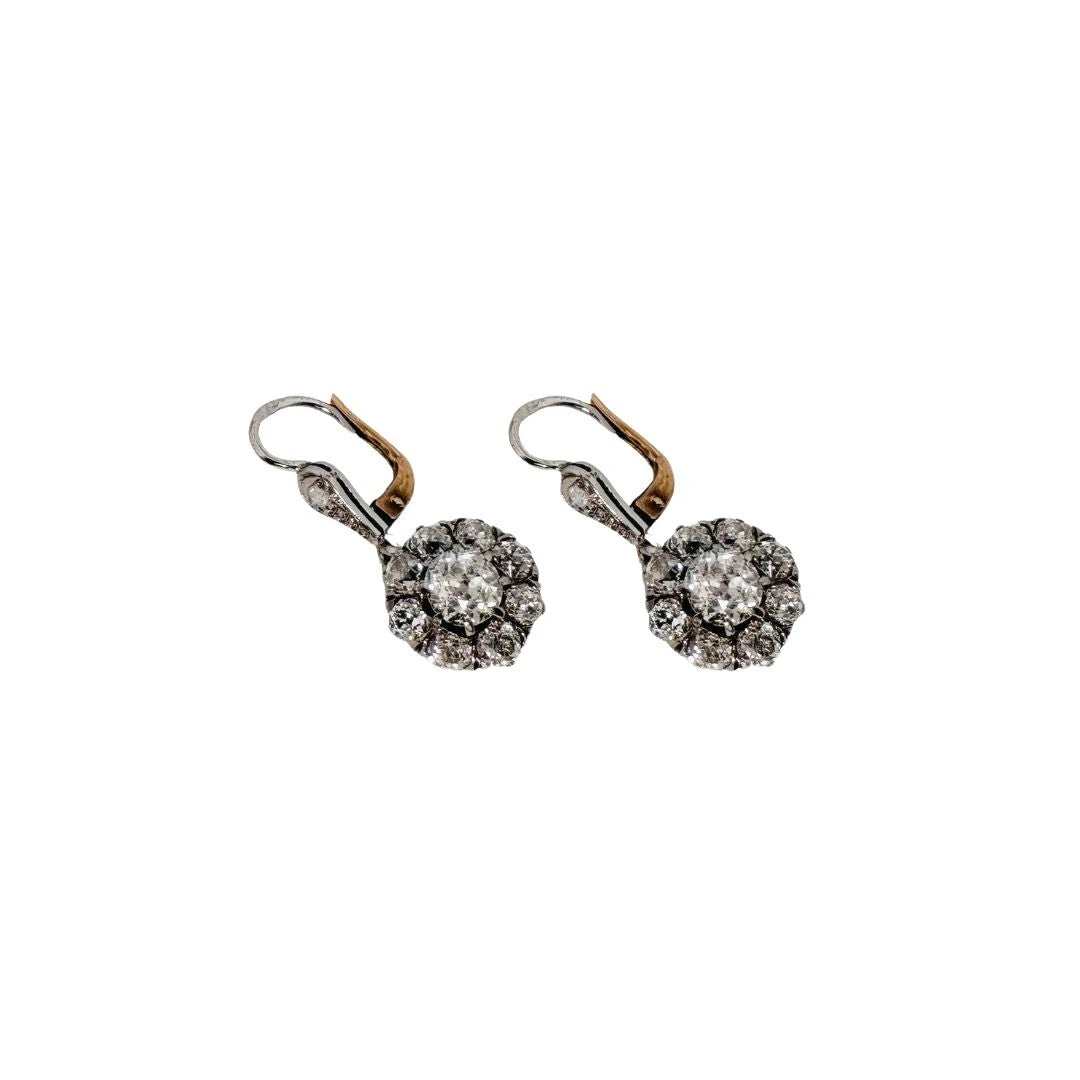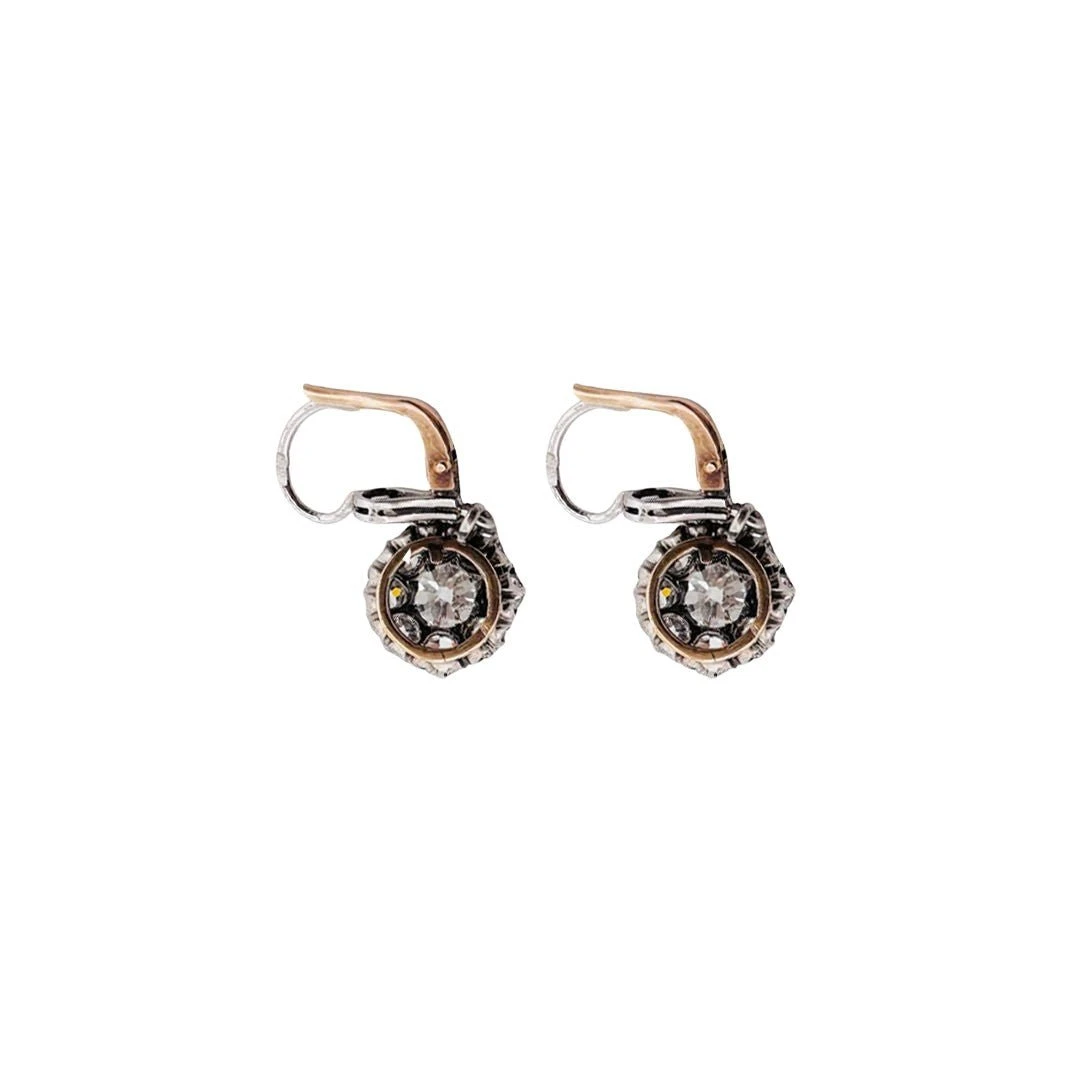 Paire de boucles d’oreilles ancienne, formant une fleur en or jaune serties d’un diamant en son centre dans un entourage de diamants. Le fermoir est à brisure vers l’arrière.