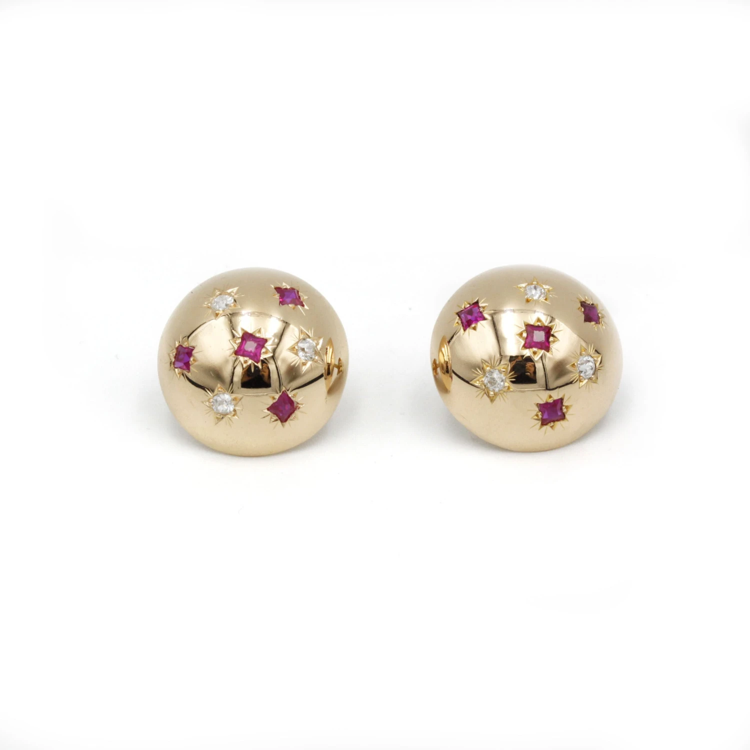 Boucles d’oreilles bombées en or jaune 750‰, serties en étoiles de rubis synthétiques Verneuil taille carrée, et de diamants. Fermoirs papillons.