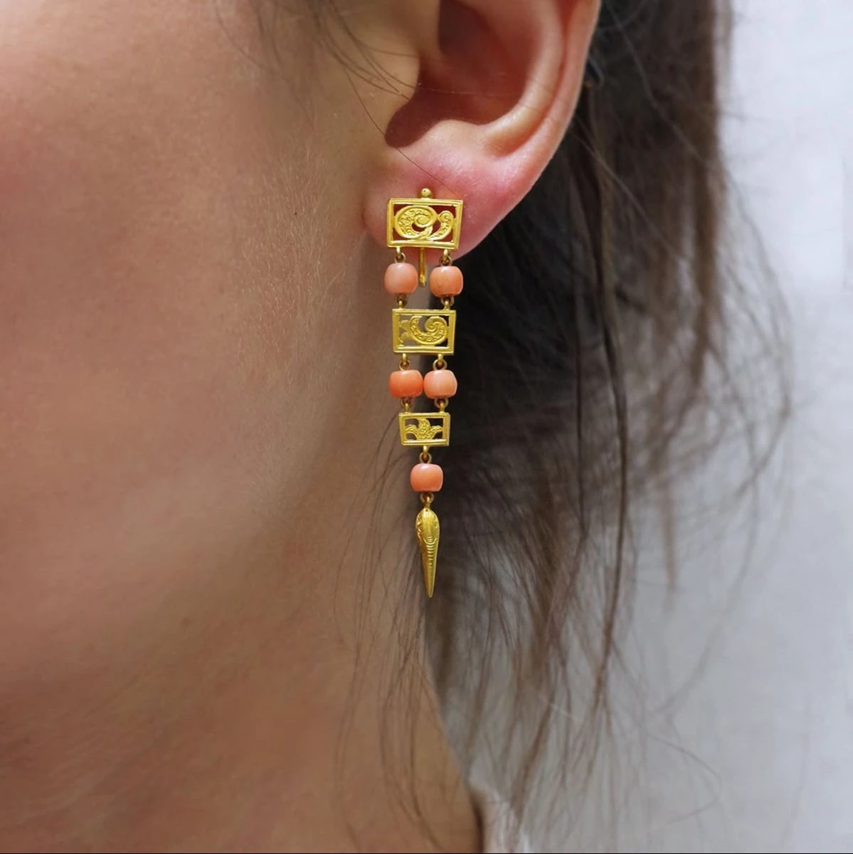 Boucles D’oreilles Pendantes En Or Jaune Et Corail