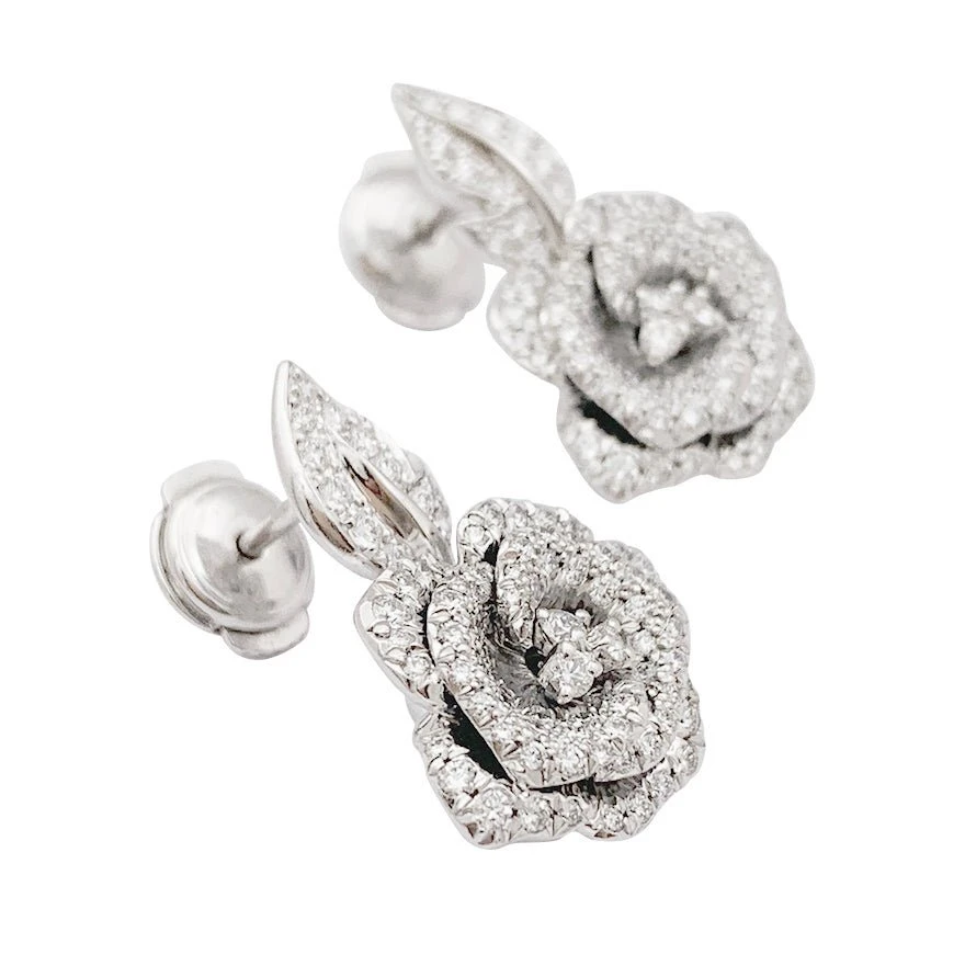 Boucles d’oreilles Dior Bagatelle en or blanc et diamants. Elles sont confectionnées en or blanc 18 carats, un métal précieux qui apporte une brillance et une durabilité exceptionnelles. La collection « Rose Dior Bagatelle » est l’œuvre de Victoire de Castellane, directrice artistique de Dior Joaillerie.