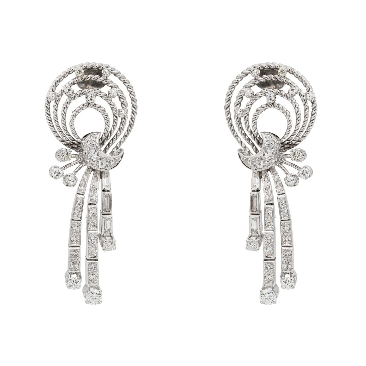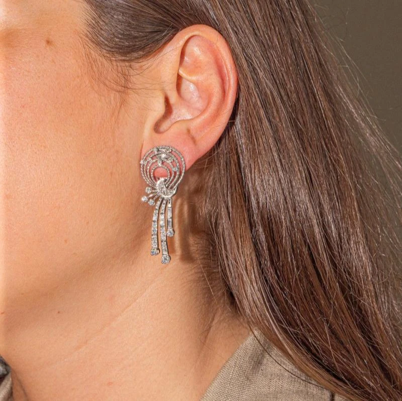 Paire de boucles d’oreilles rétro sertie de diamants. en palladium 999 millièmes (24 carats). 2 diamants taille brillant. d’un poids total d’environ 0.30 ct. (chaque diamant d’un poids d’environ 0.15 ct). 8 diamants taille ancienne. environ. d’un poids total d’environ 0.4 ct (chaque diamant d’un poids d’environ 0.05 ct). 10 diamants taille ancienne. d’un poids total d’environ 0.2 ct (chaque diamant d’un poids d’environ 0.02 ct). 40 diamants taille ancienne. environ. d’un poids total d’environ 0.4 ct (chaque diamant d’un poids d’environ 0.01 ct). 4 diamants taille baguette. d’un poids total d’environ 0.24 ct (chaque diamant d’un poids d’environ 0.06 ct). dimensions: 4.69 cm x 1.81 cm. poids total: 13.34 g. excellent état
