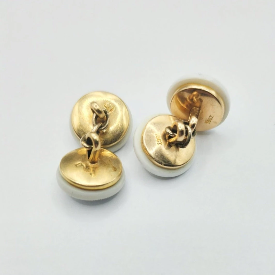 Paire de boutons de manchettes en or jaune 14 carats ornée d’une pastille de résine blanche centrée d’une perle bouton.