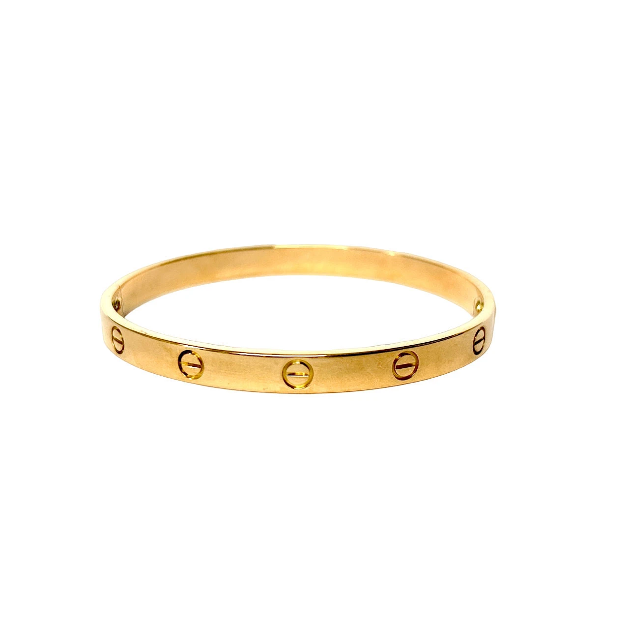 Très beau bracelet Cartier Love des annĂ©es 1990 en or jaune composĂ© d’un jonc plat ornĂ© de motifs de vis gravĂ©es.