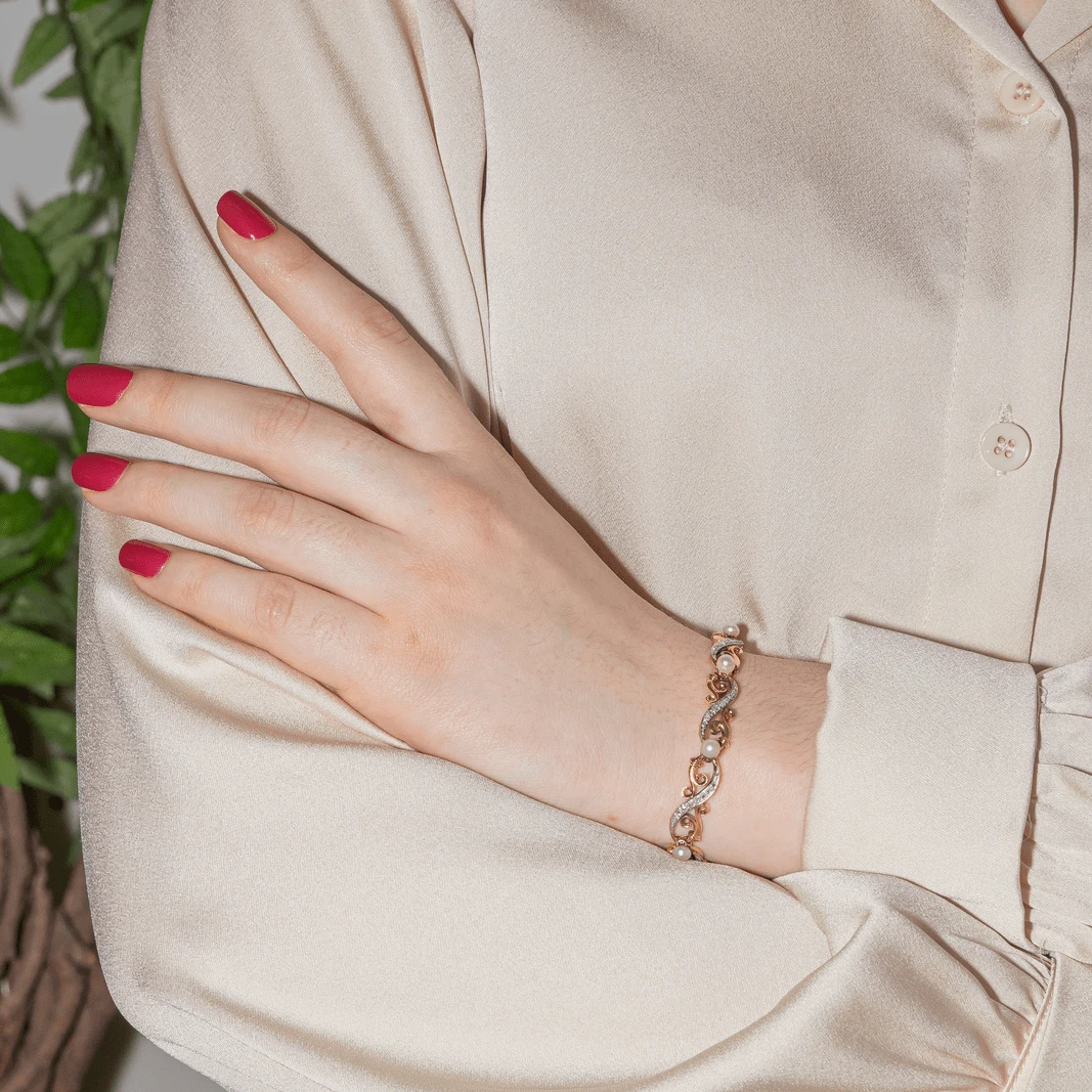 Bracelet en or jaune et blanc 750 millièmes (18 carats). serti de perles fines et de diamants. 8 perles fines taille ronde. diamètre : 4.10 mm. de 64 diamants taille brillant. d’un poids total d’environ 0.32 ct. longueur : 18.00 cm. largeur : 0.75 cm. Ă©paisseur : 0.64 cm. fermoir languette avec chaĂ®ne sĂ©curitĂ©. poids total : 21.49 g. poinçon tĂŞte d’aigle. excellent Ă©tat